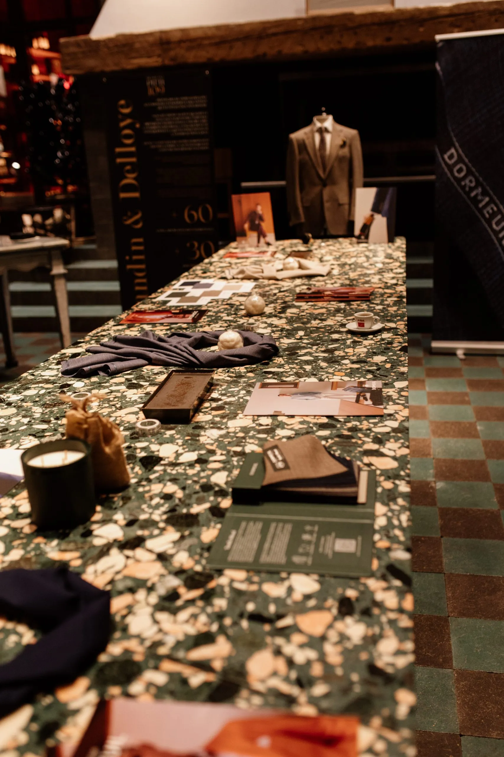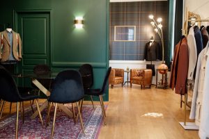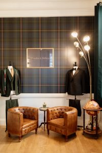 La boutique offre une atmosphère élégante et chaleureuse, inspirée des clubs anglais et des ateliers de tailleurs traditionnels. Les murs vert profond et le papier peint tartan apportent une identité forte, tandis que le mobilier, alliant bois massif, cuir patiné et détails dorés, vient équilibrer l’ensemble avec raffinement.