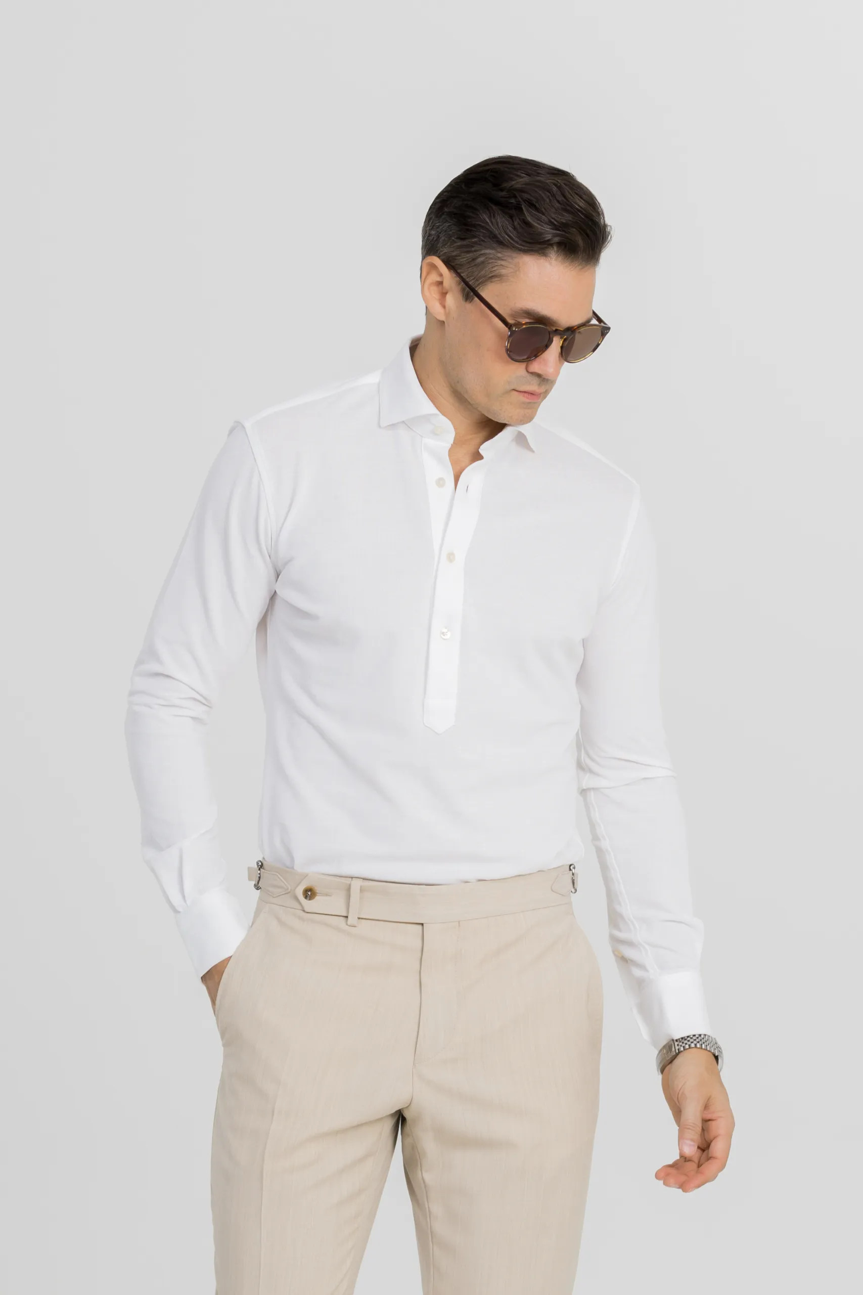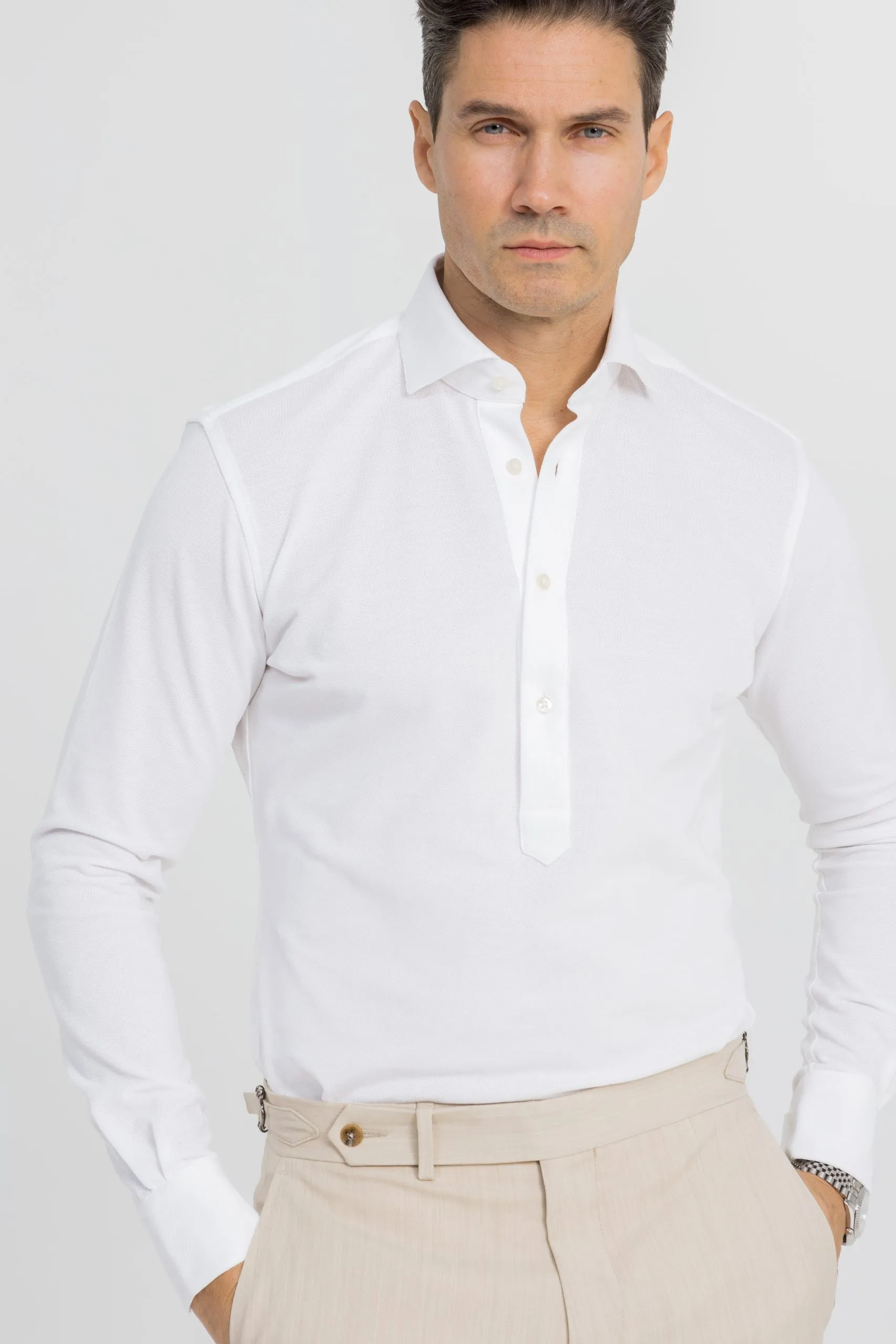 Discover the Carlo Bassetti pop-over shirt from every angle. Whether worn under a suit or at the weekend, it offers an unprecedented level of comfort without sacrificing your style.