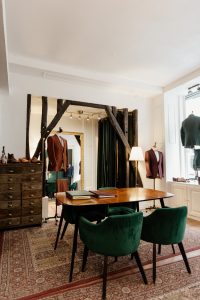 Spread over 2 floors, it exudes the cosy and stately atmosphere typical of all Blandin & Delloye boutiques. In winter, you can choose your outfit by the fireplace, and in summer, you can take advantage of the room’s abundant natural light. As part of our masculine universe, you can enjoy a whisky while browsing through our many fabric packs.