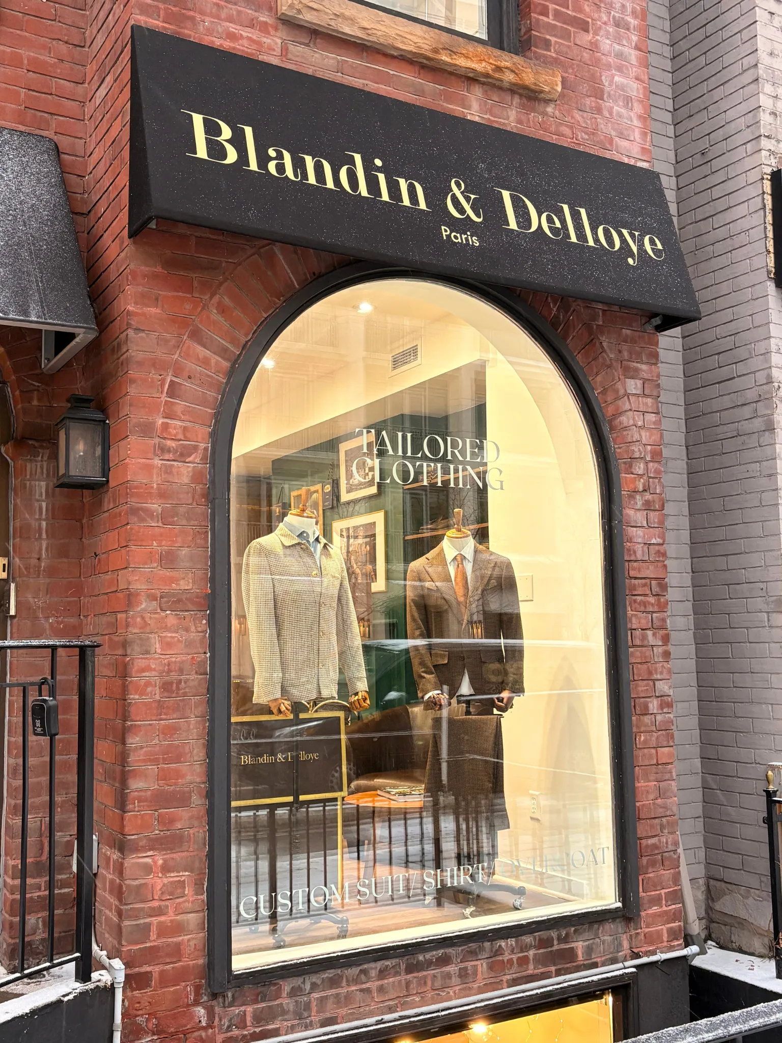 A navy double-breasted suit, in a wool linen and silk blend. White shirt with a wide French collar, cufflinks and mother-of-pearl buttons. For shoes, double buckles!
