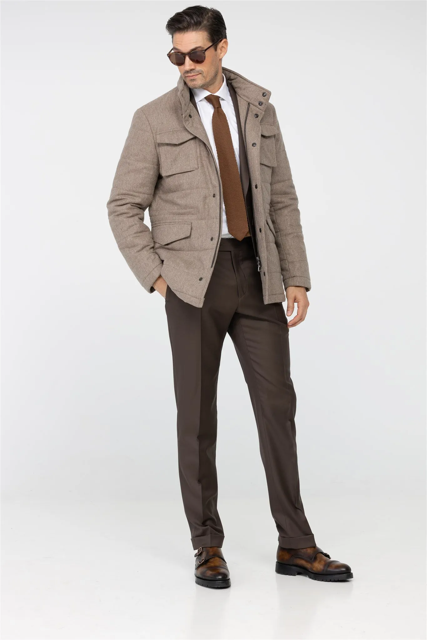 Discover our bespoke beige quilted jacket, a trendy wardrobe staple for cooler weather. In this flannel, you'll find comfort and elegance for your outfits.