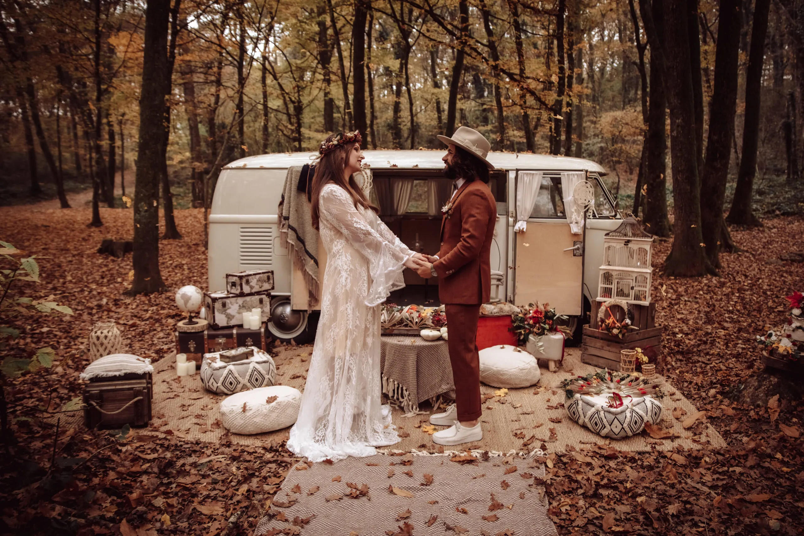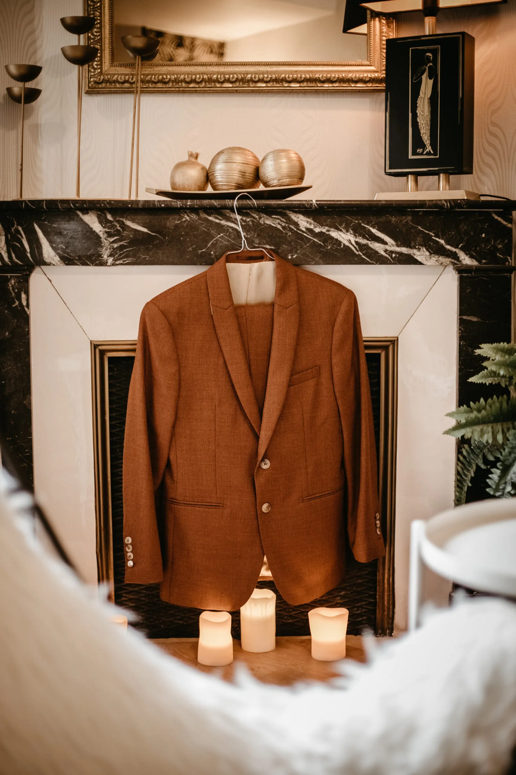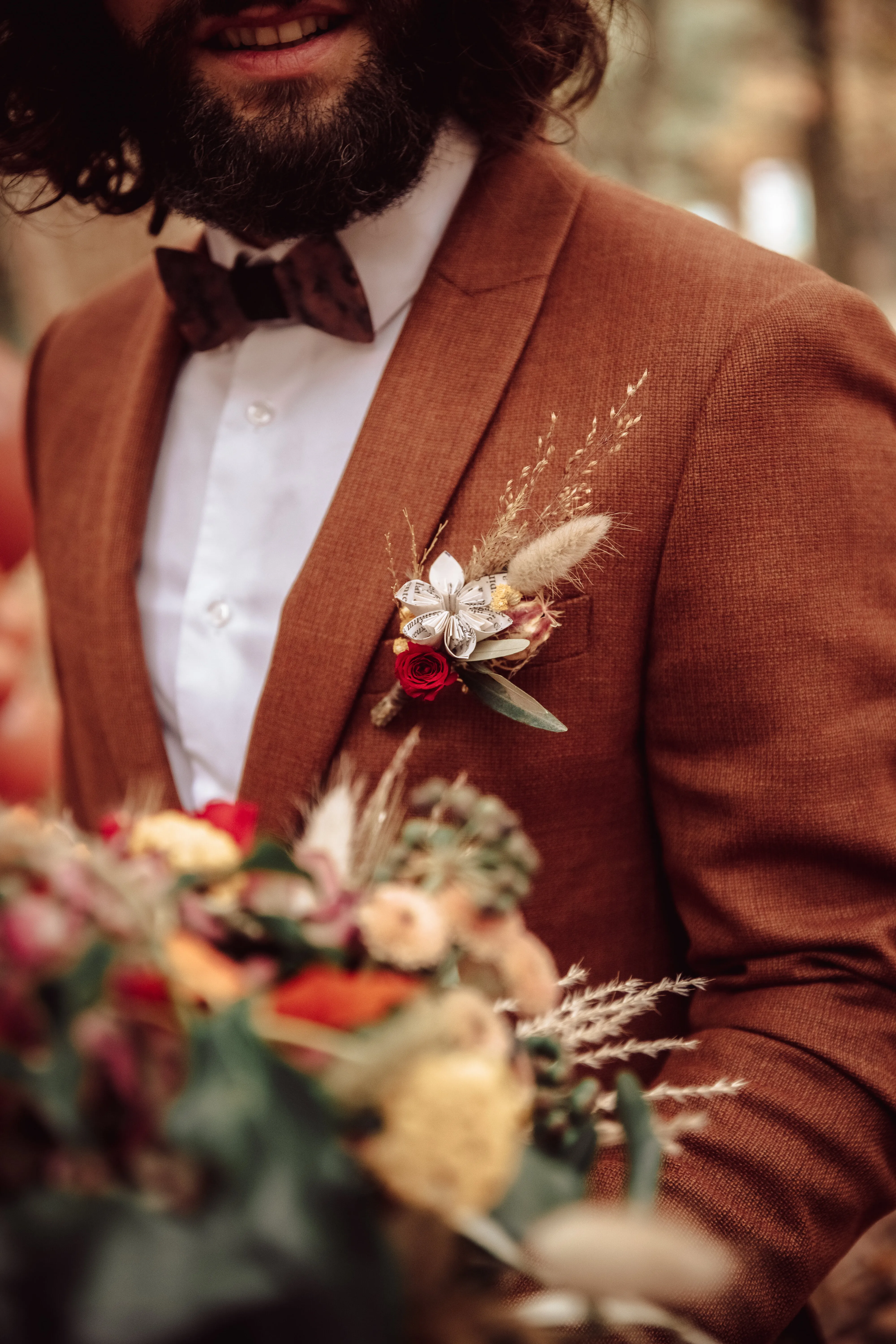 Choose our terracotta suit for a versatile outfit that will surprise your guests. Its warm tones will carry you away in a cocoon of love and tenderness.