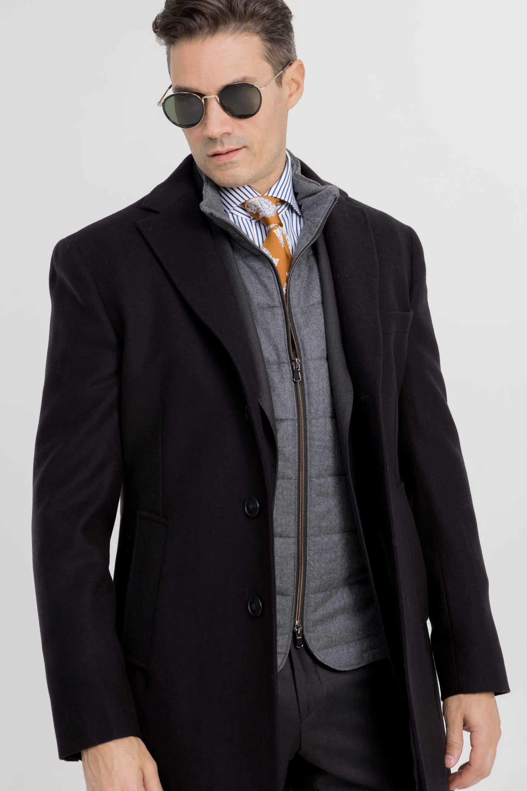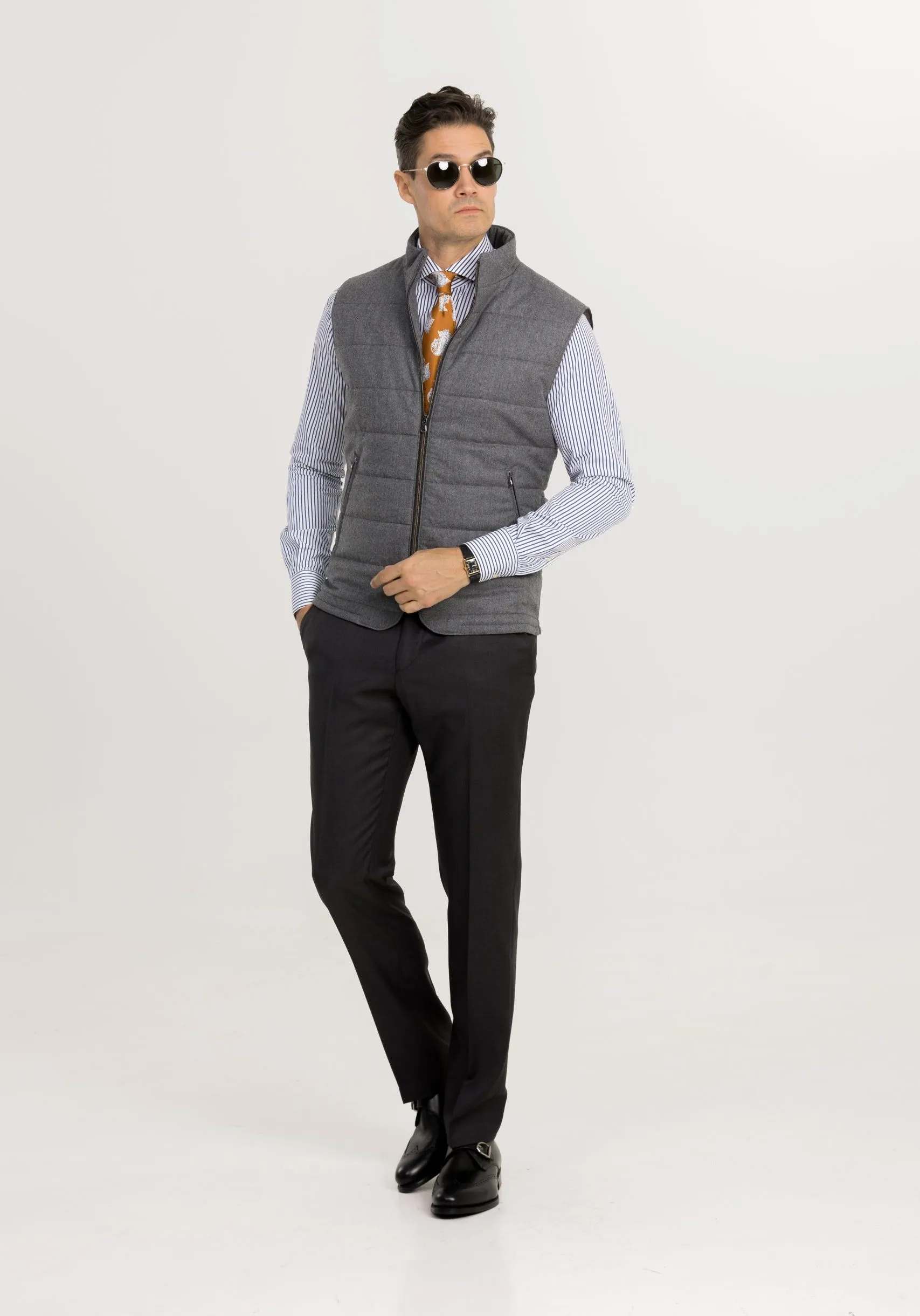 Crafted from 100% wool flannel by Vitale Barberis Canonico with a water-repellent finish, this bodywarmer blends natural warmth with resistance to light rain. Its 7.5 cm spaced quilting maintains insulation while keeping the garment supple. A waterproof front zipper and slanted zipped pockets complete this design, built for both practicality and elegance.