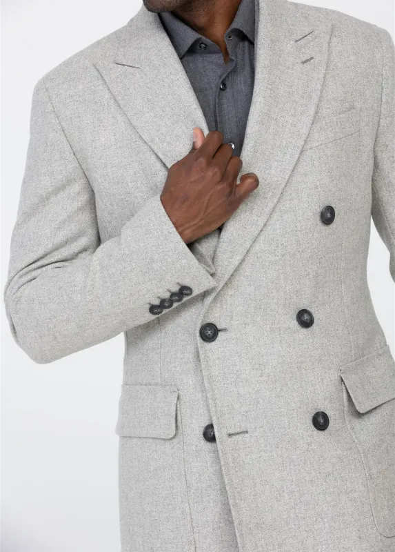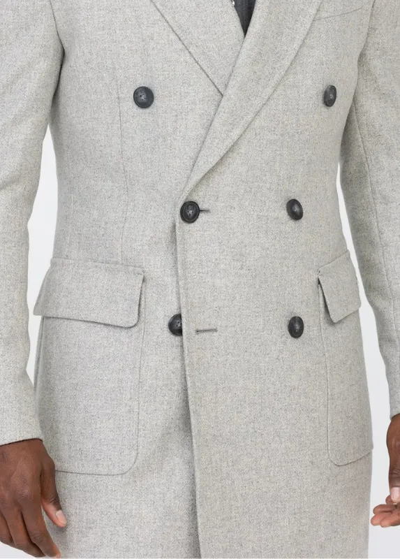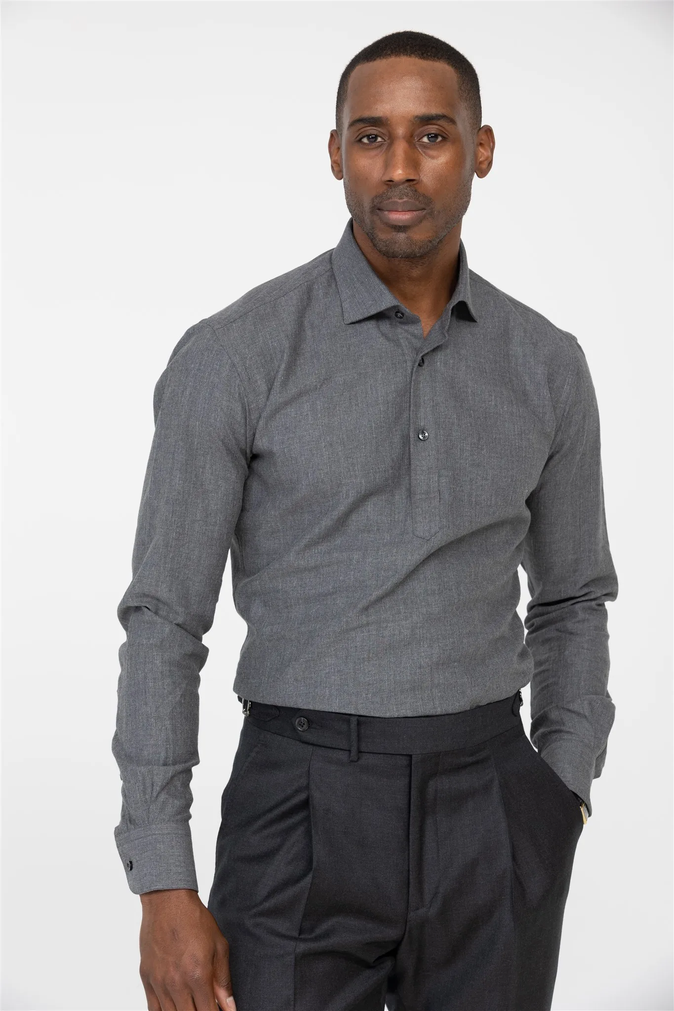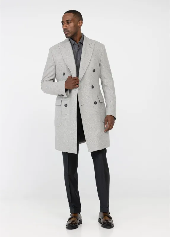 This outfit in several shades of gray features a 100% wool double-breasted coat by Dugdale, a light-gray flannel straight jacket and charcoal-gray pleated pants in wool twill. It is completed by a tailored cotton flannel popover casual shirt and a pair of dark brown double-buckle shoes.
