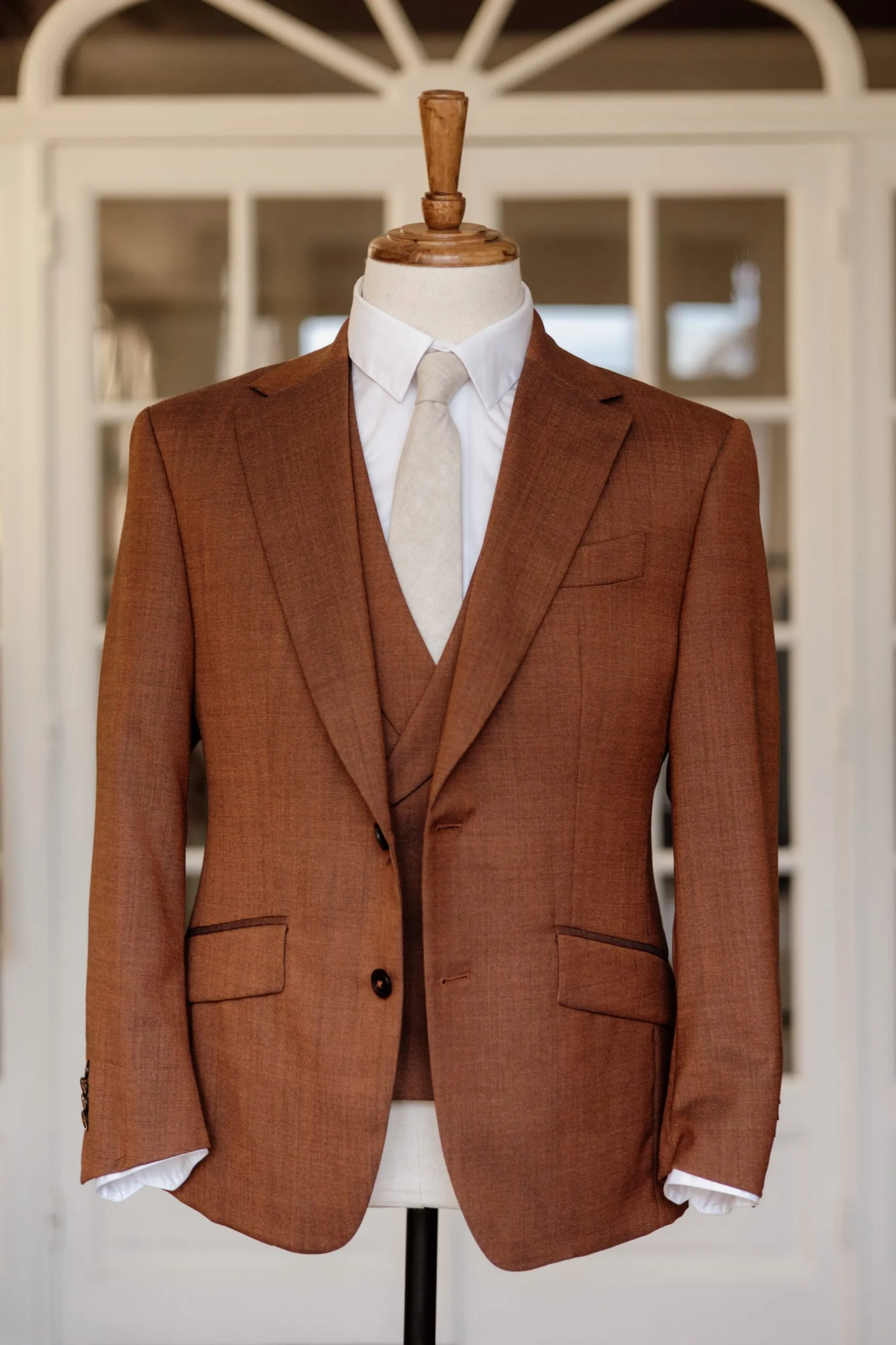 A soft-shouldered three-piece suit in deep navy worsted wool, with clean lines and rich texture. Elegant, timeless, and perfectly balanced.
