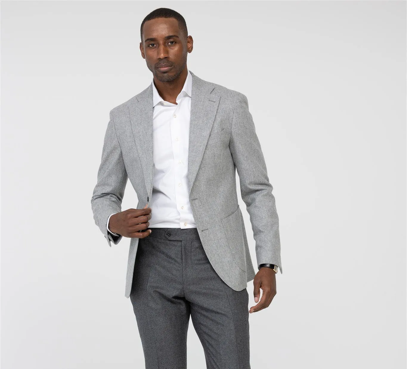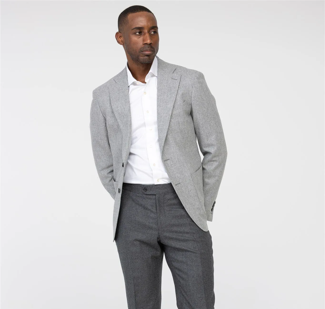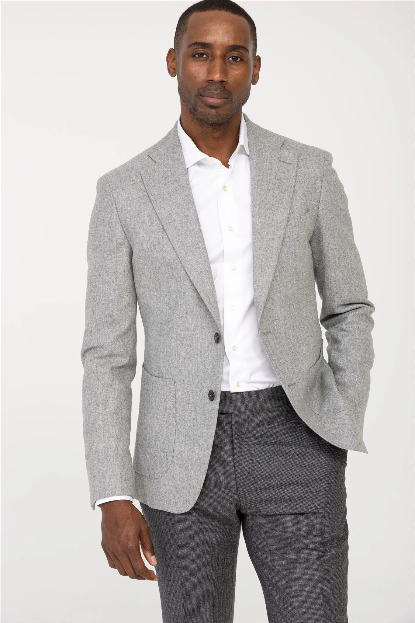 Discover the light gray flannel blazer from every angle.