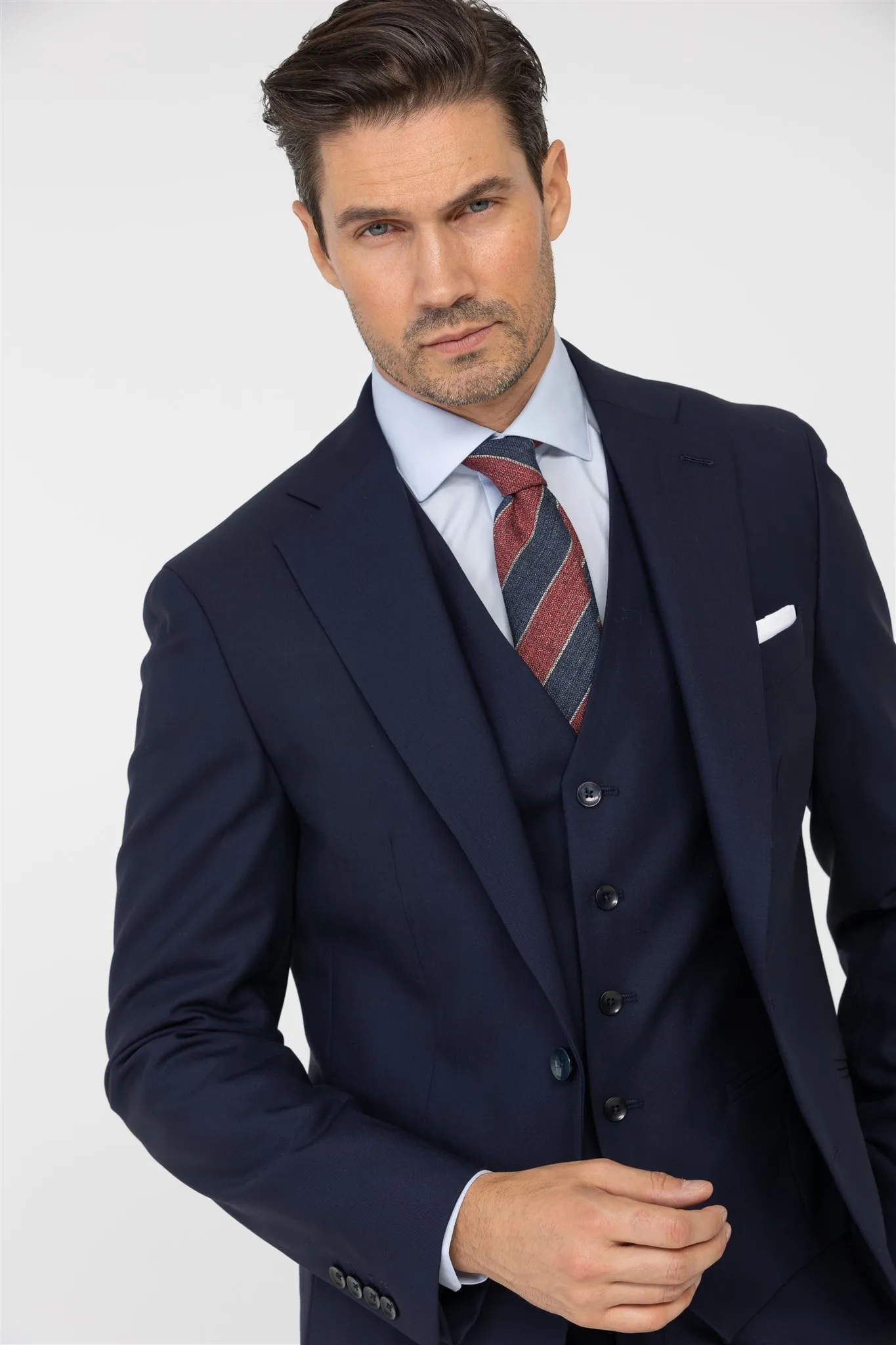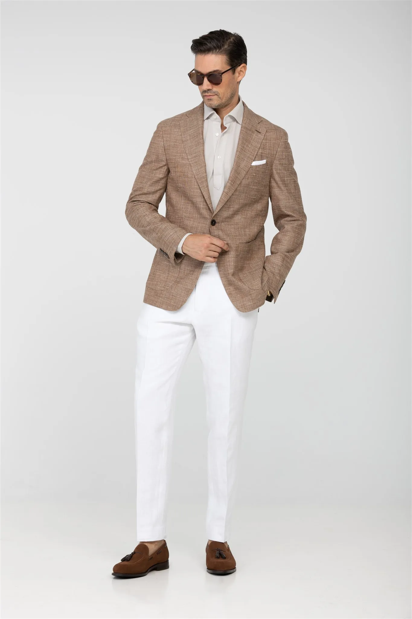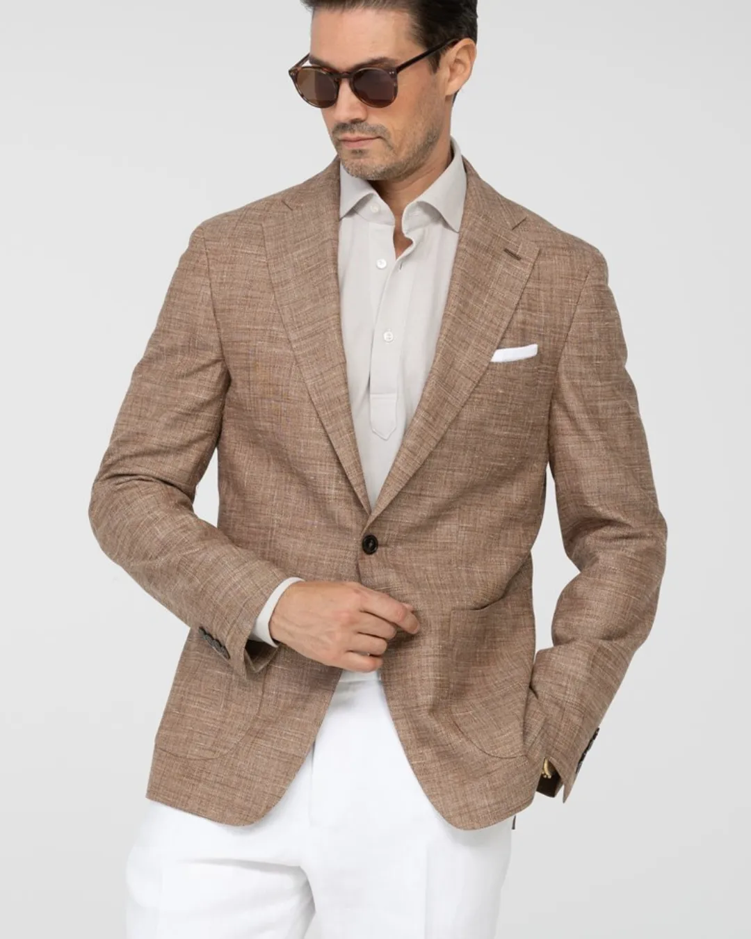 Blandin & Delloye is showcasing two looks: on the one hand, the timeless three-piece suit in navy blue, a key piece in building a sartorial wardrobe. On the other, a more summery approach with a sand jacket by Dormeuil, to be teamed with white trousers for a mismatched look that’s both elegant and casual.