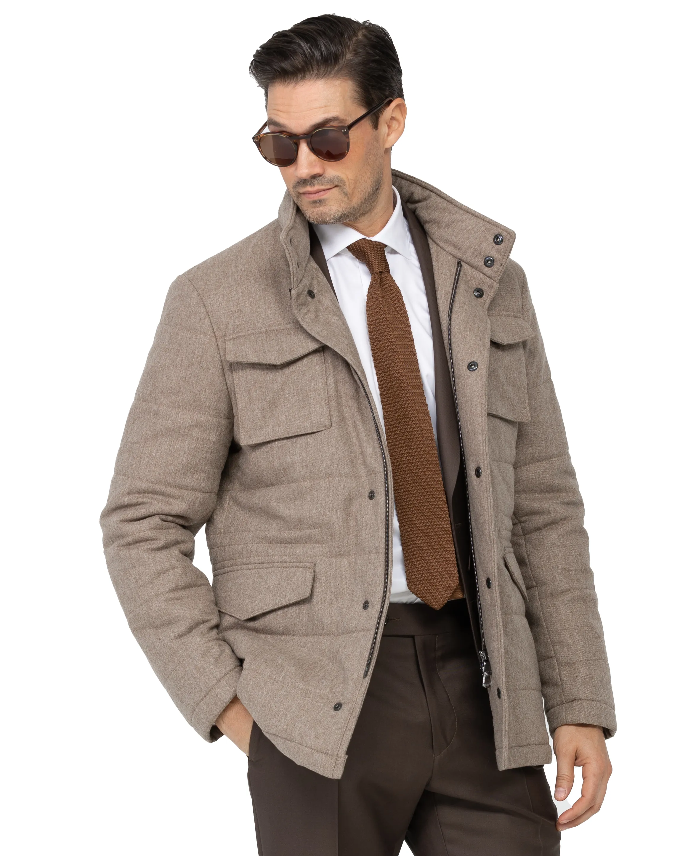 Descubra la chaqueta acolchada beige desde todos los ángulos.