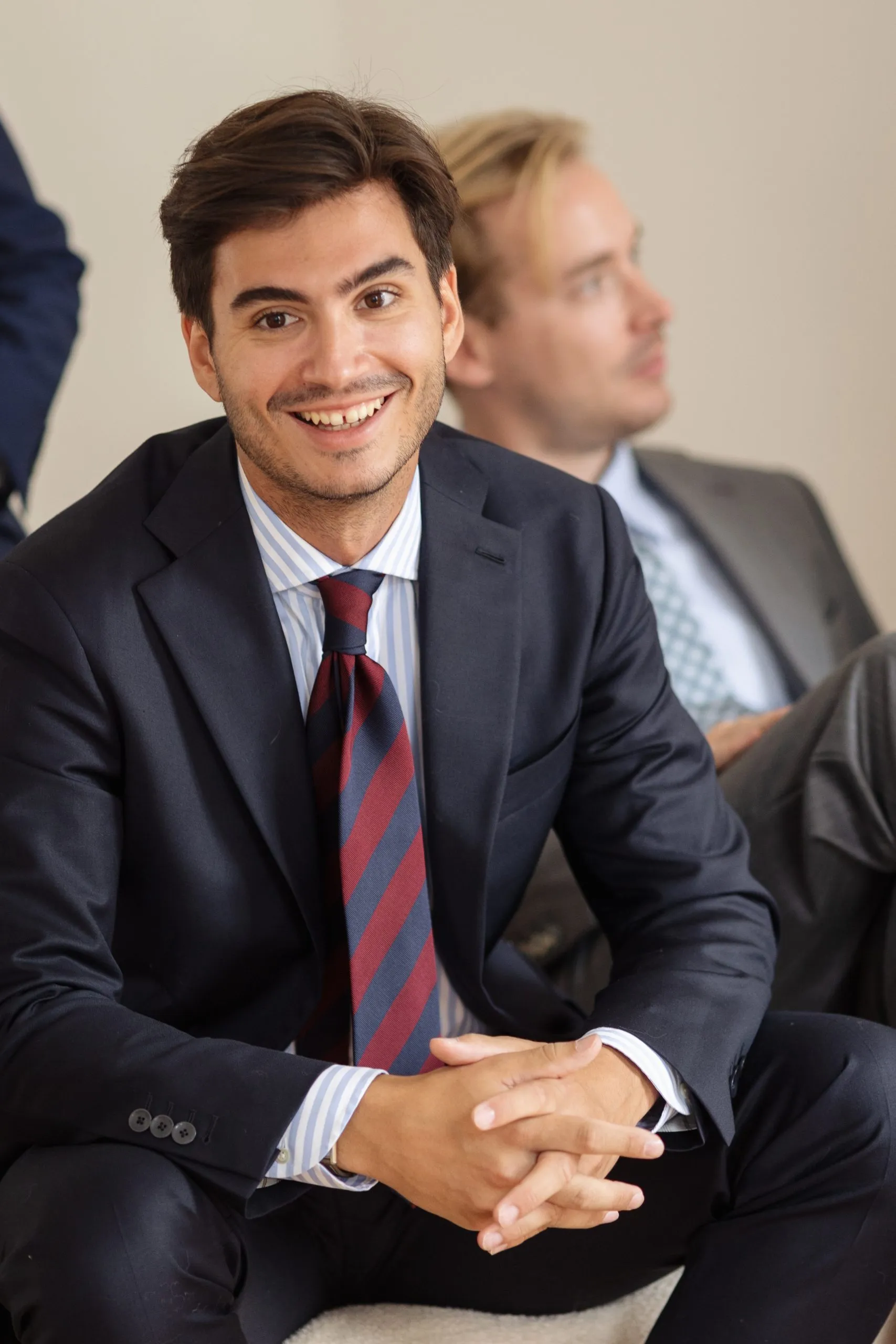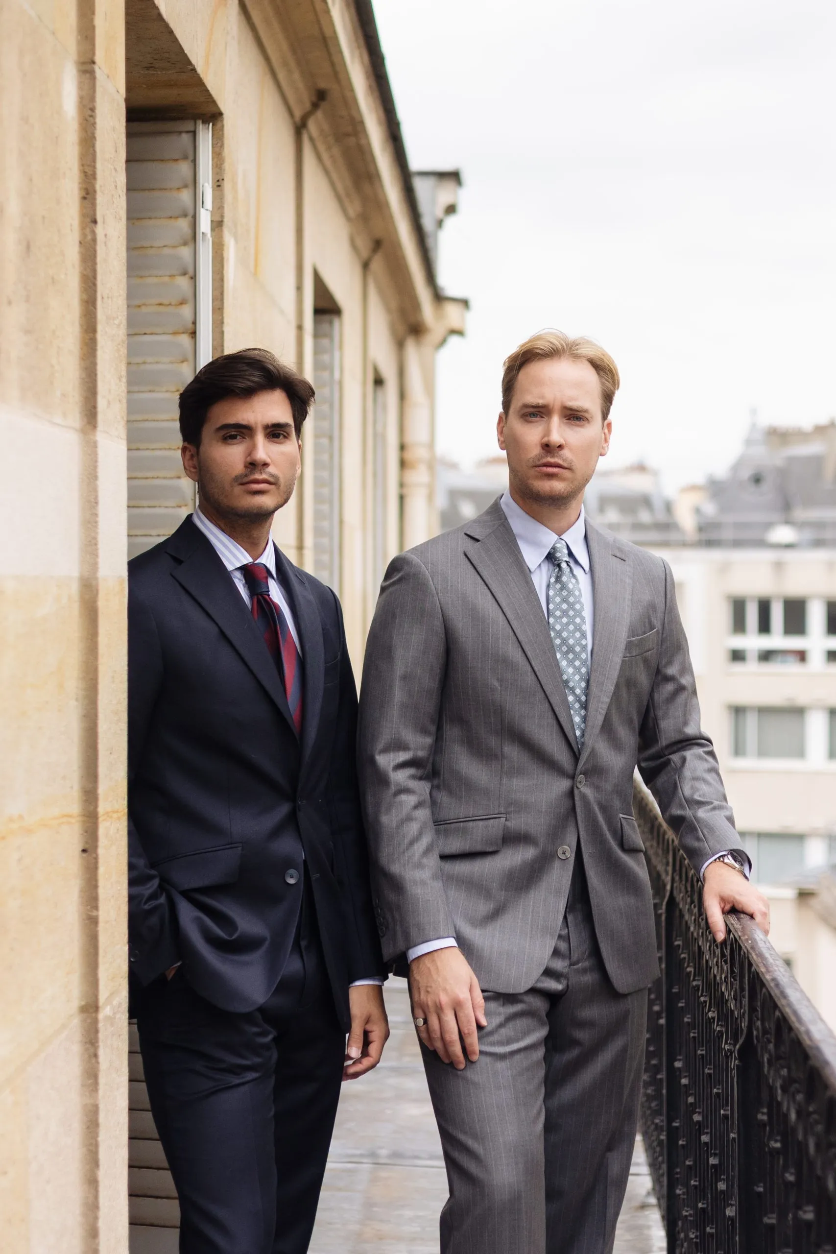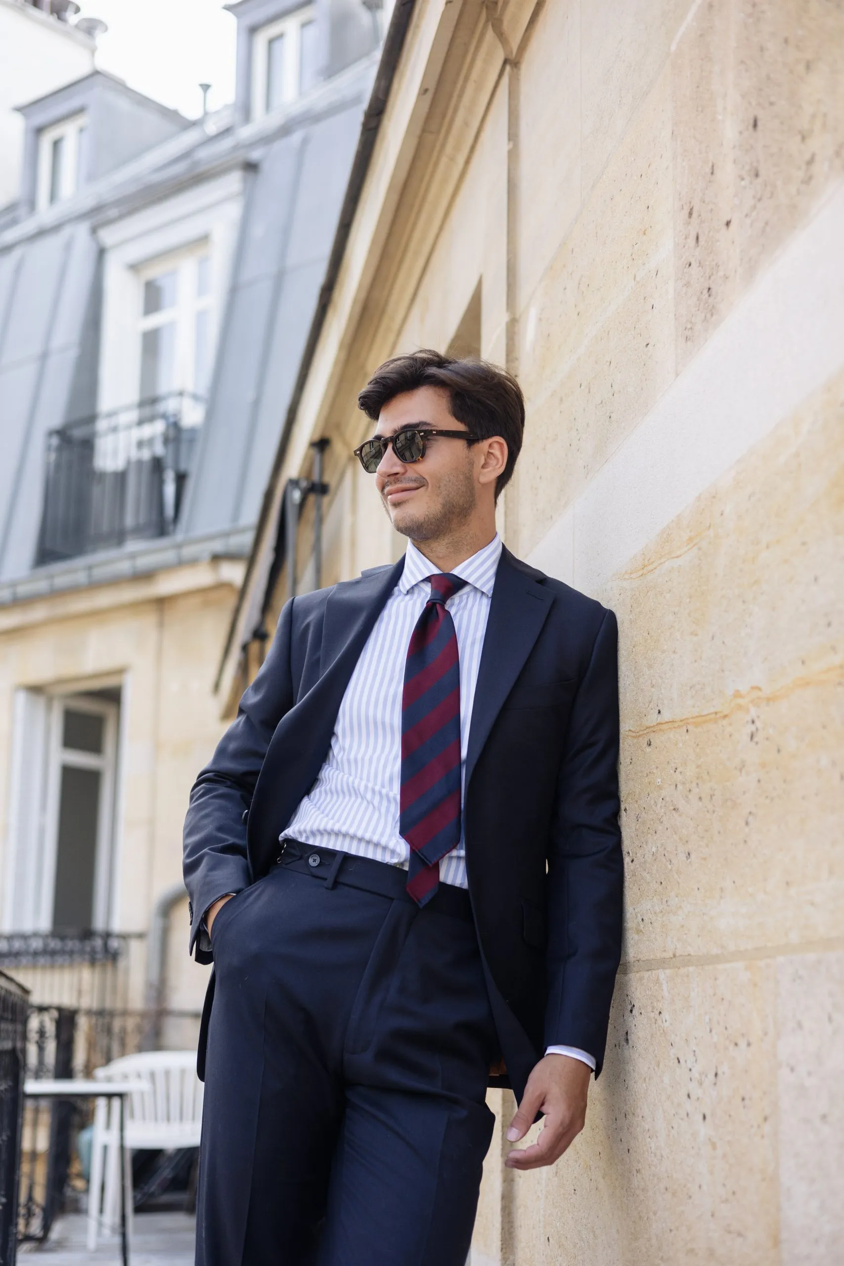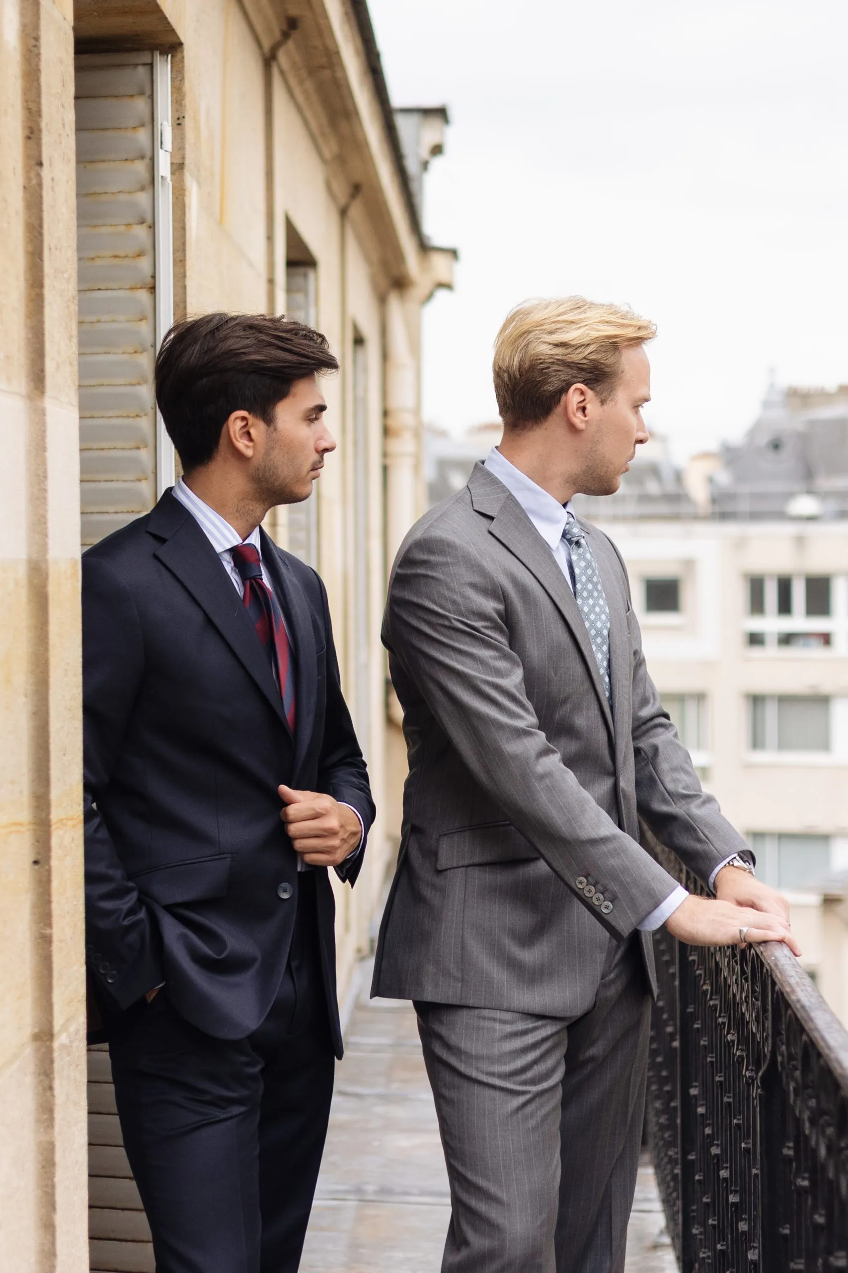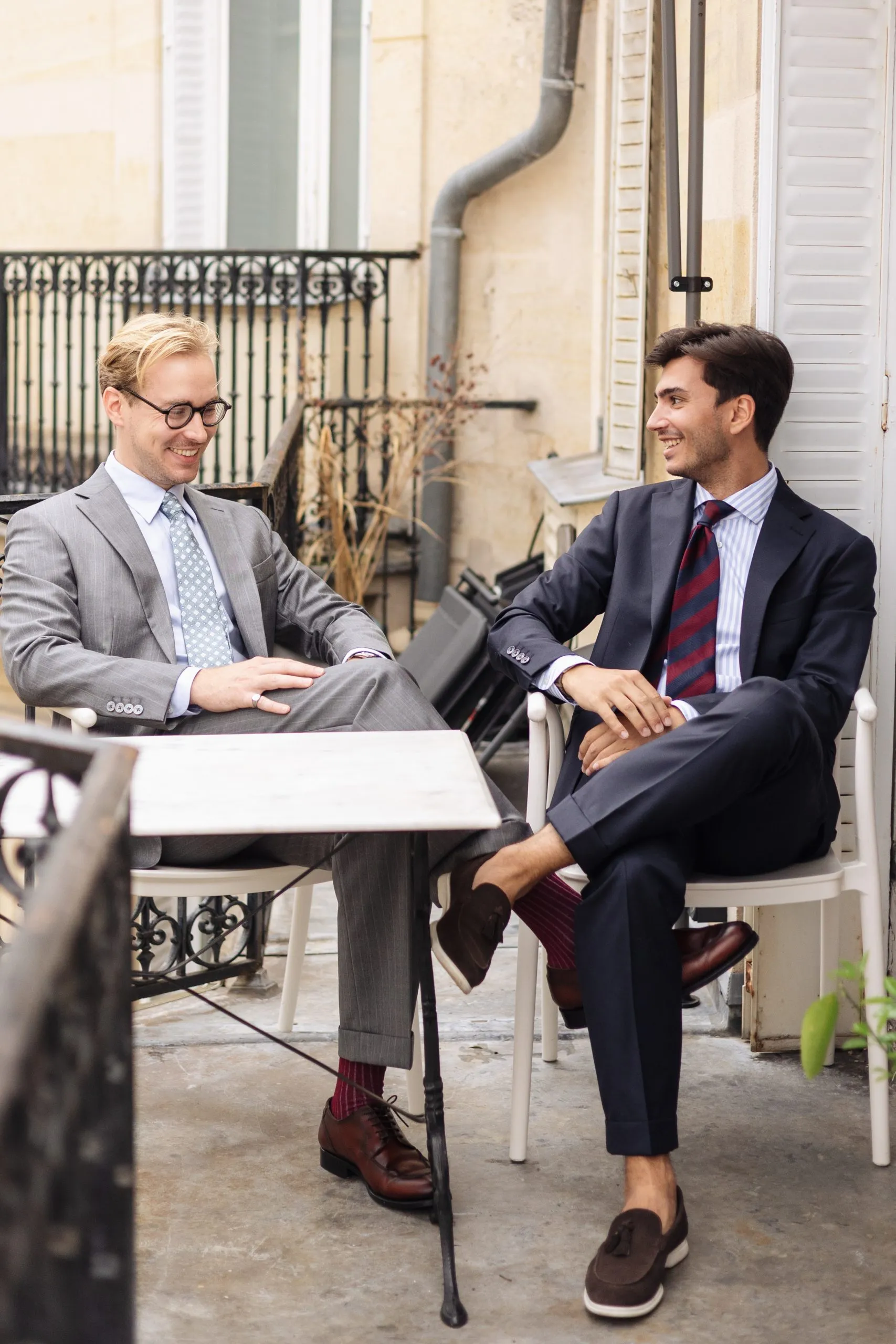 Presenta un ojal milanés hecho a mano, un bolsillo barchetta en el pecho y dos bolsillos inclinados ribeteados con solapas reforzadas.