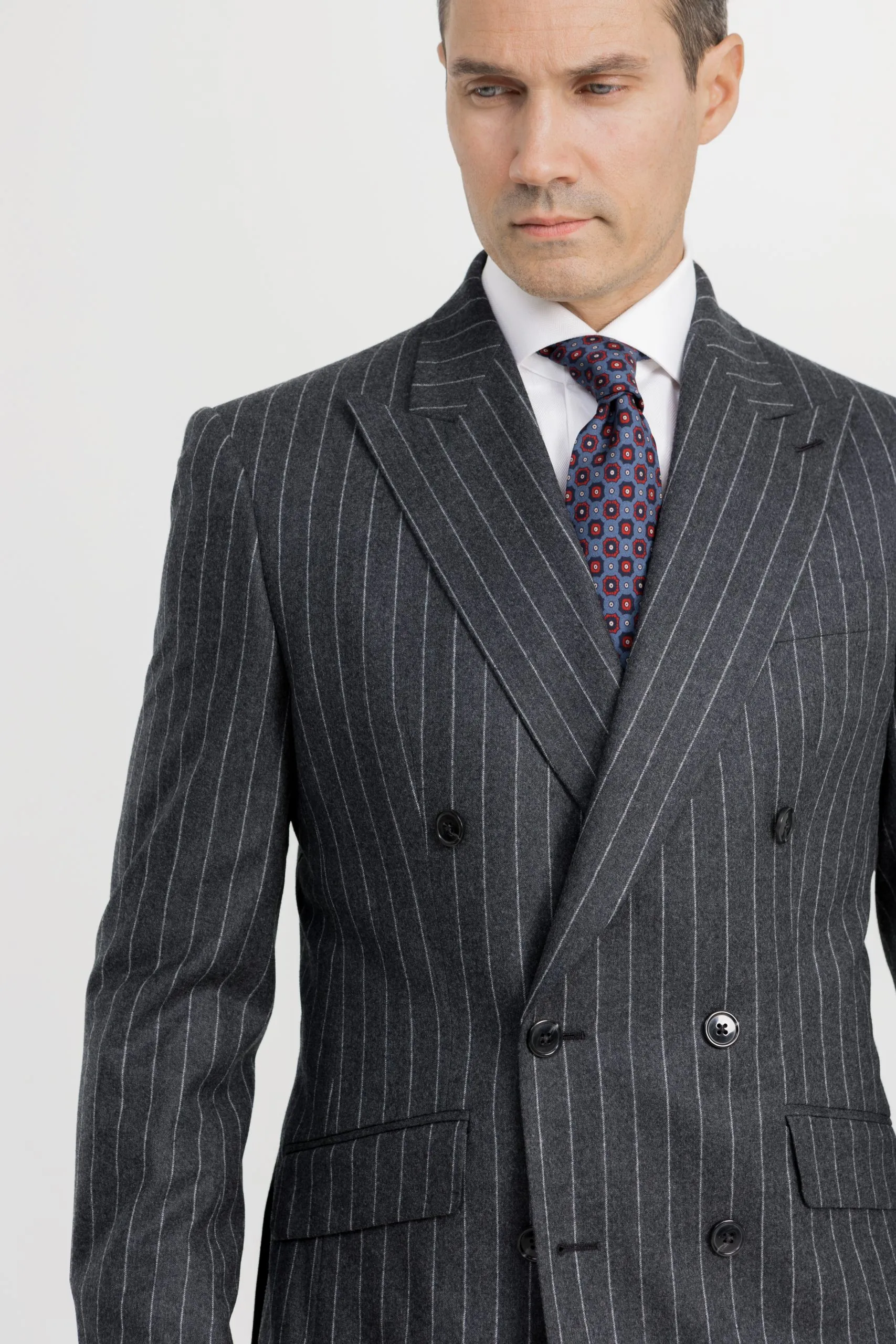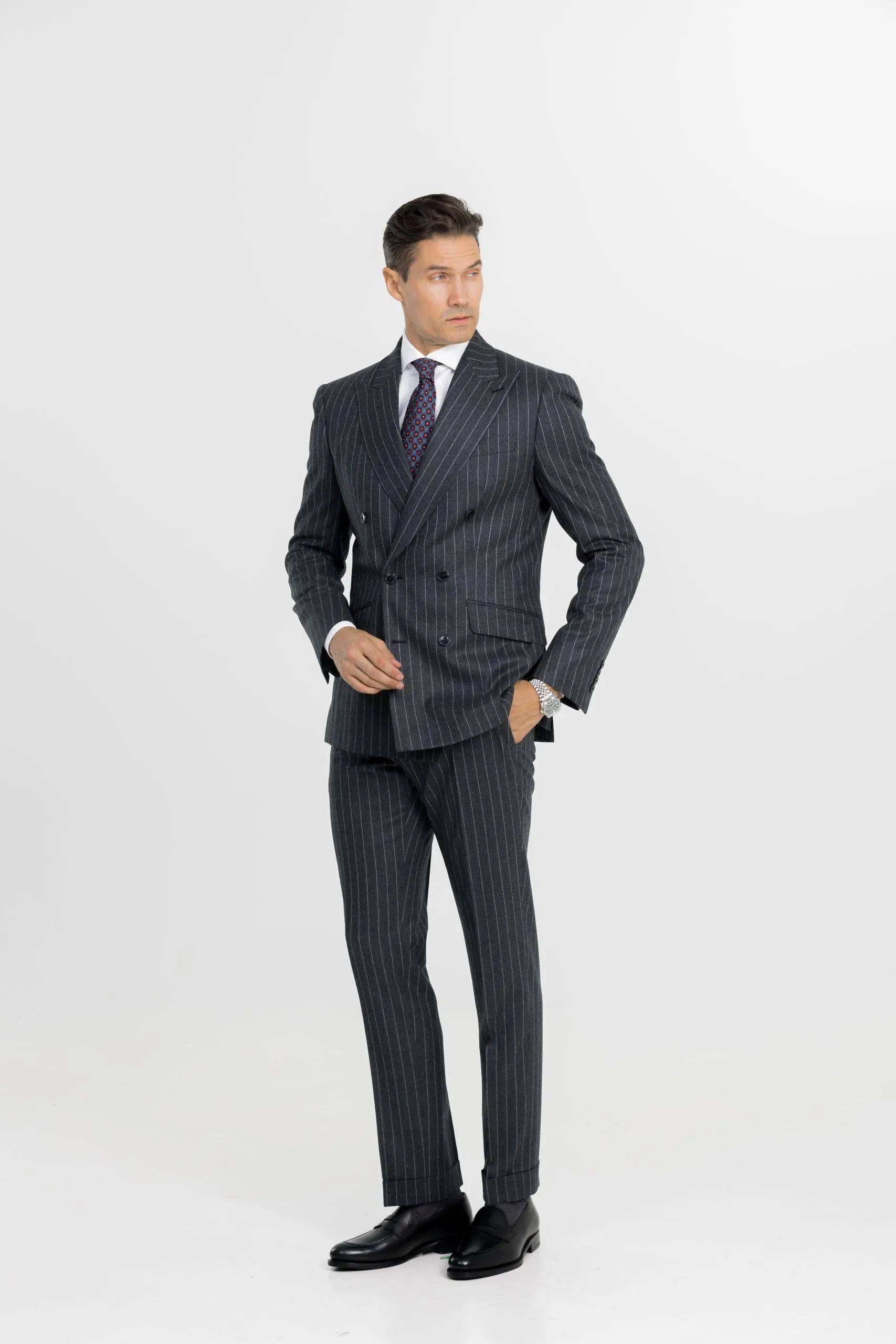 El traje de franela de doble botonadura es una inversión acertada para los hombres que buscan una prenda versátil, elegante y duradera. Su estilo asertivo atraerá en un entorno profesional, pero también brillará en ocasiones más formales. Es una pieza que le llevará a través de las estaciones con aplomo y facilidad.