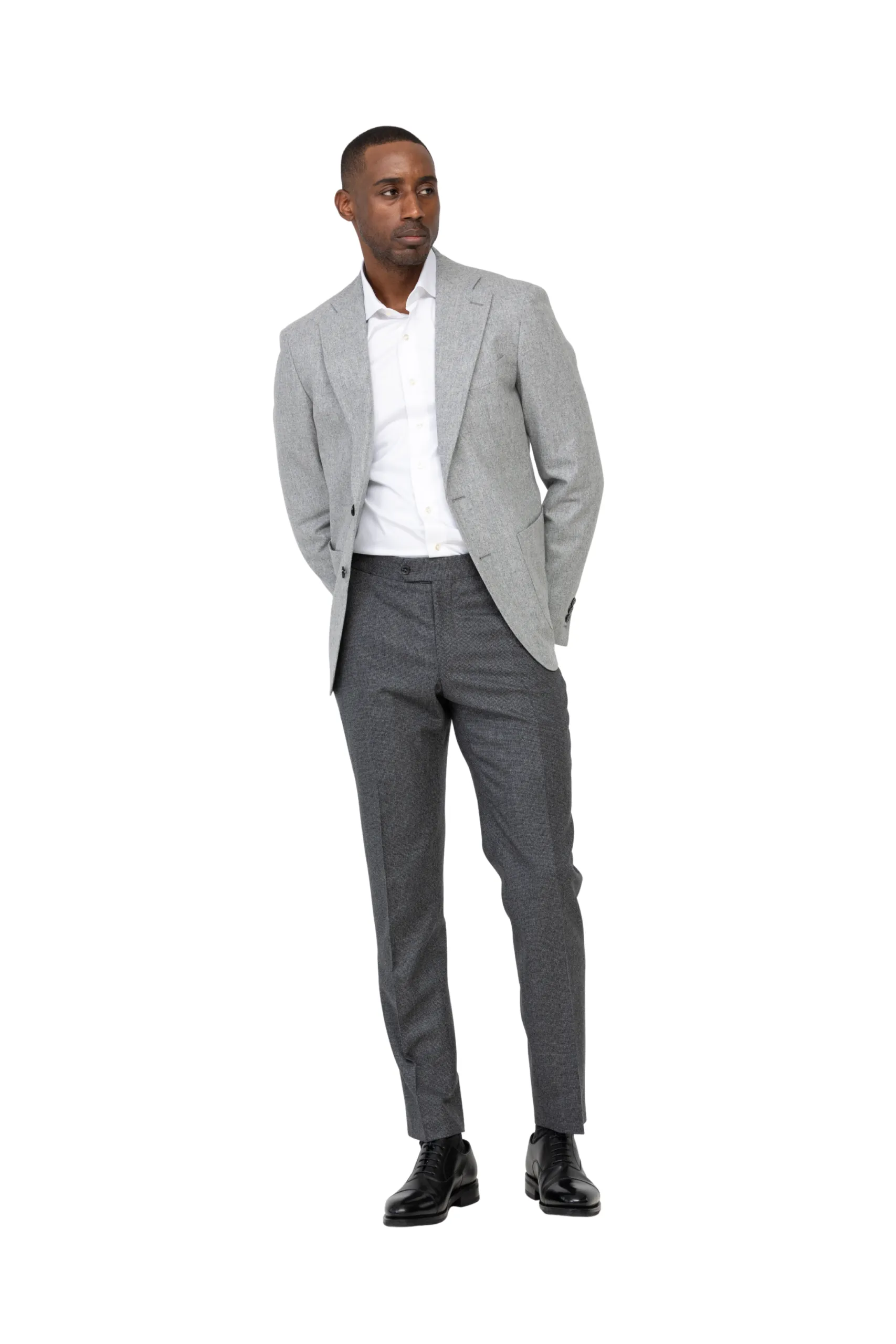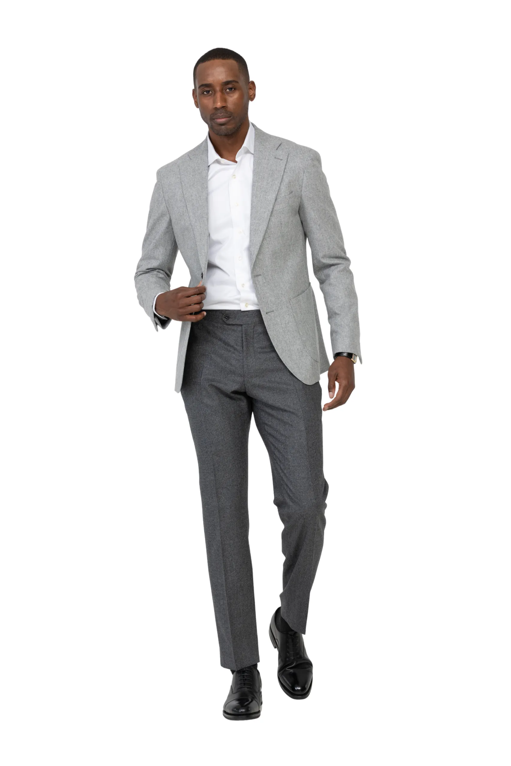 Nuestro conjunto desparejado a medida es perfecto para llevar a diario al trabajo, pero también para salidas informales o elegantes. Llevar una chaqueta gris claro con unos pantalones más oscuros y una camisa con cuello napolitano crea un conjunto sencillo y elegante.
