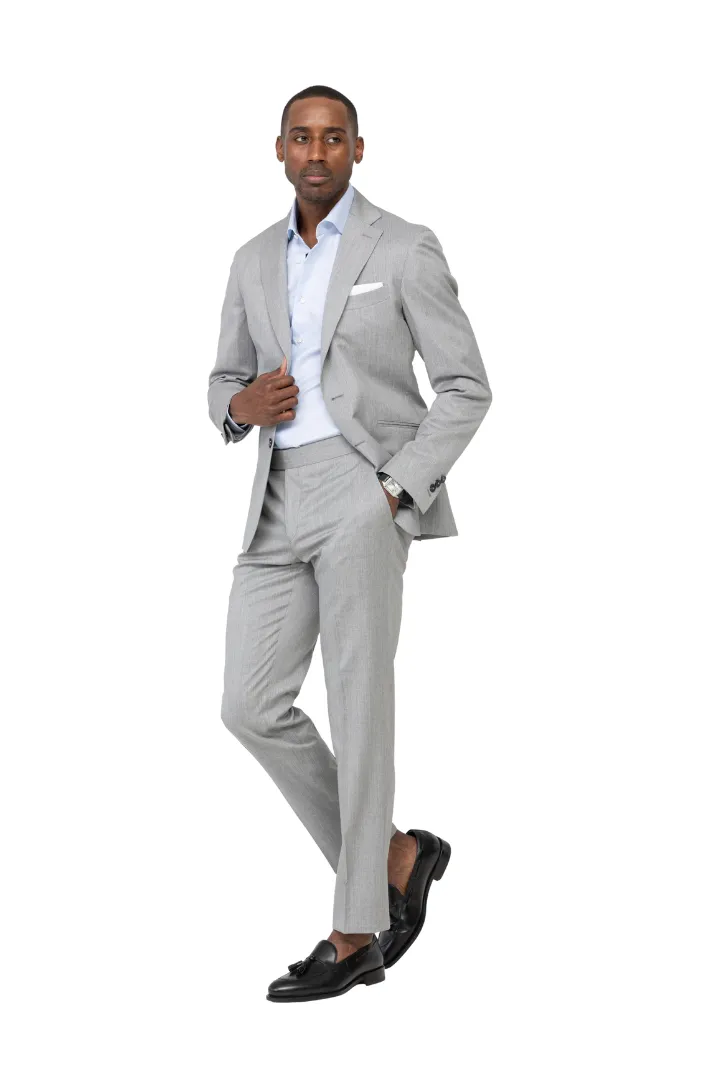 Nuestro traje a medida es perfecto para el trabajo diario. El color gris lo convierte en un atuendo refinado y primaveral que sigue pareciendo formal.