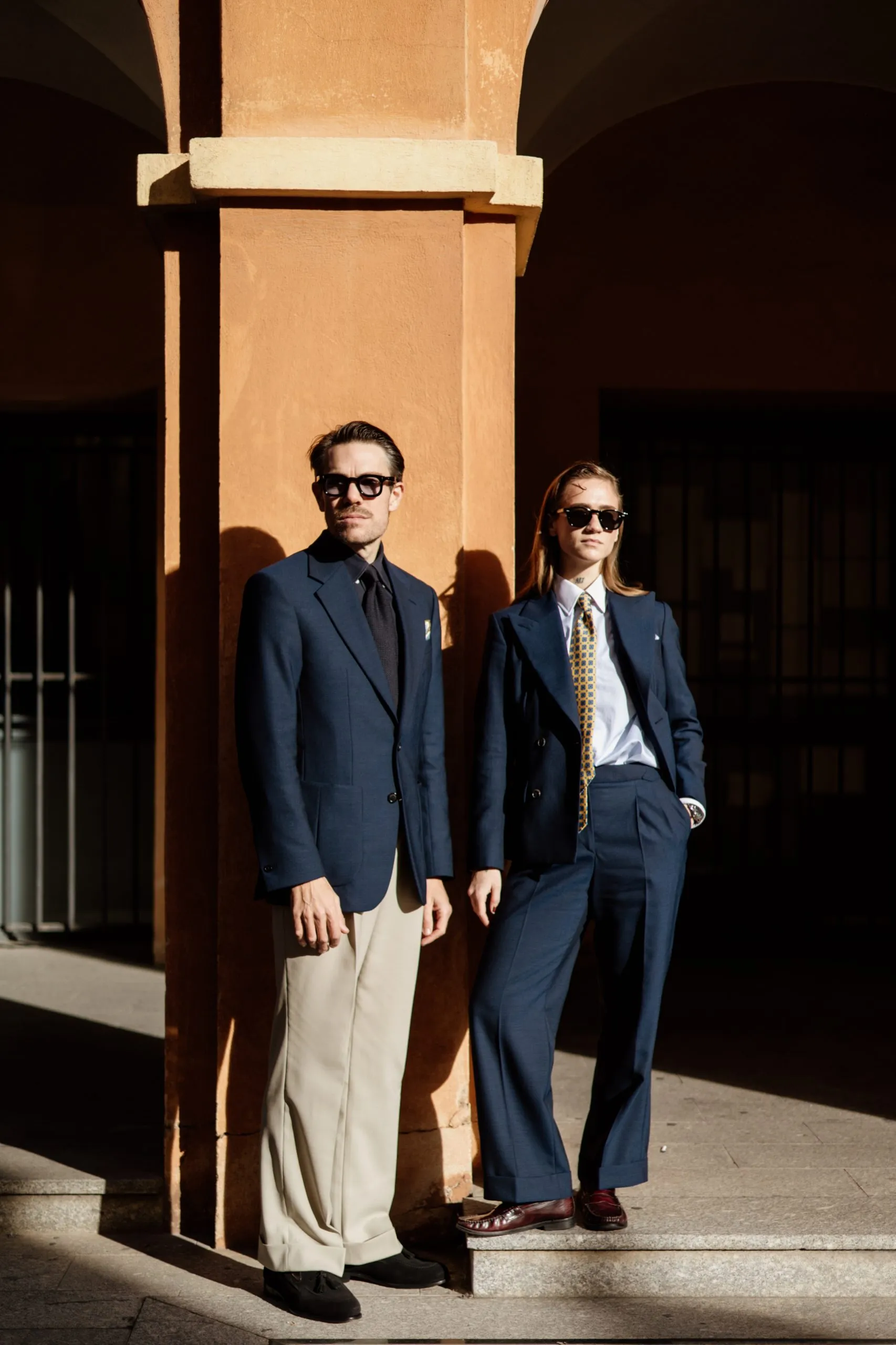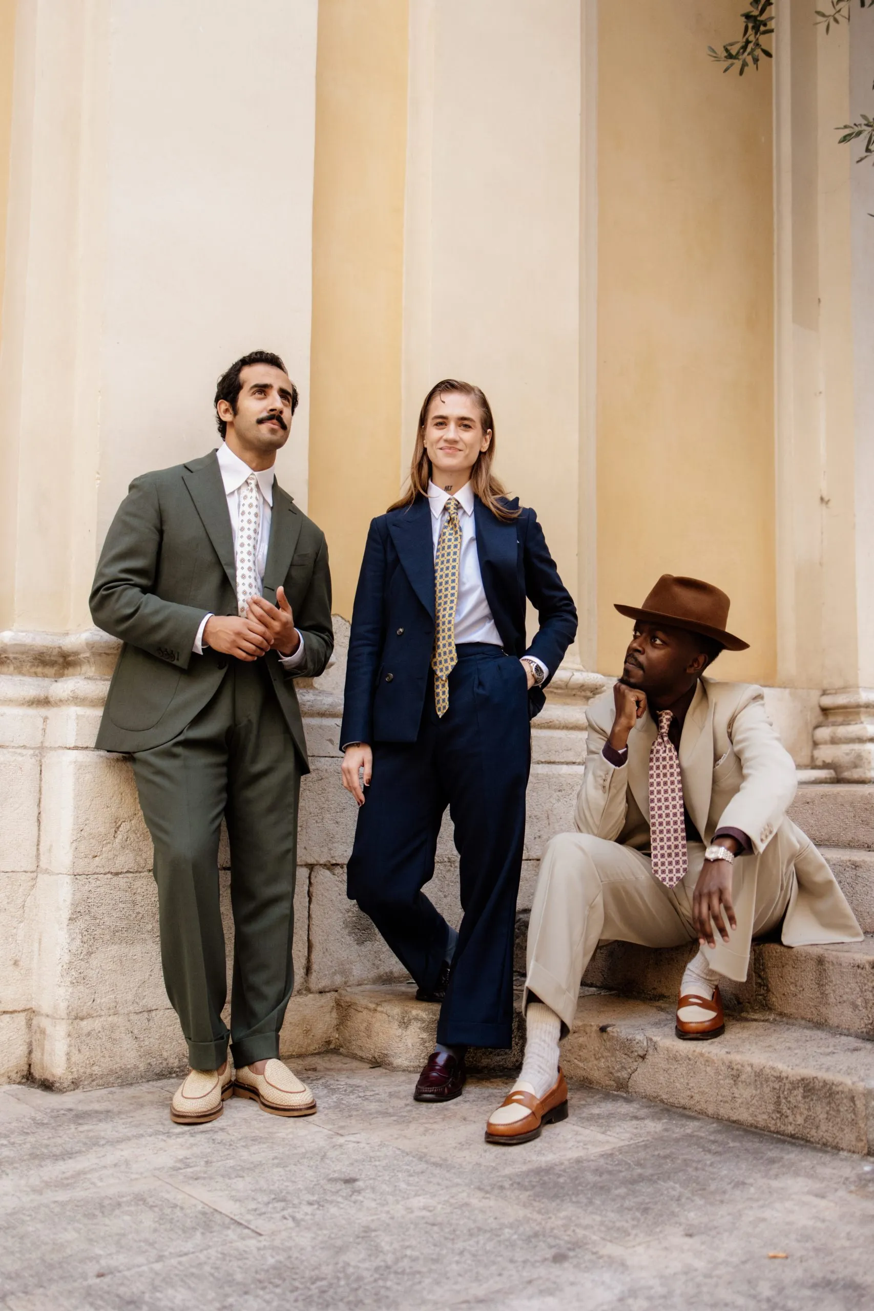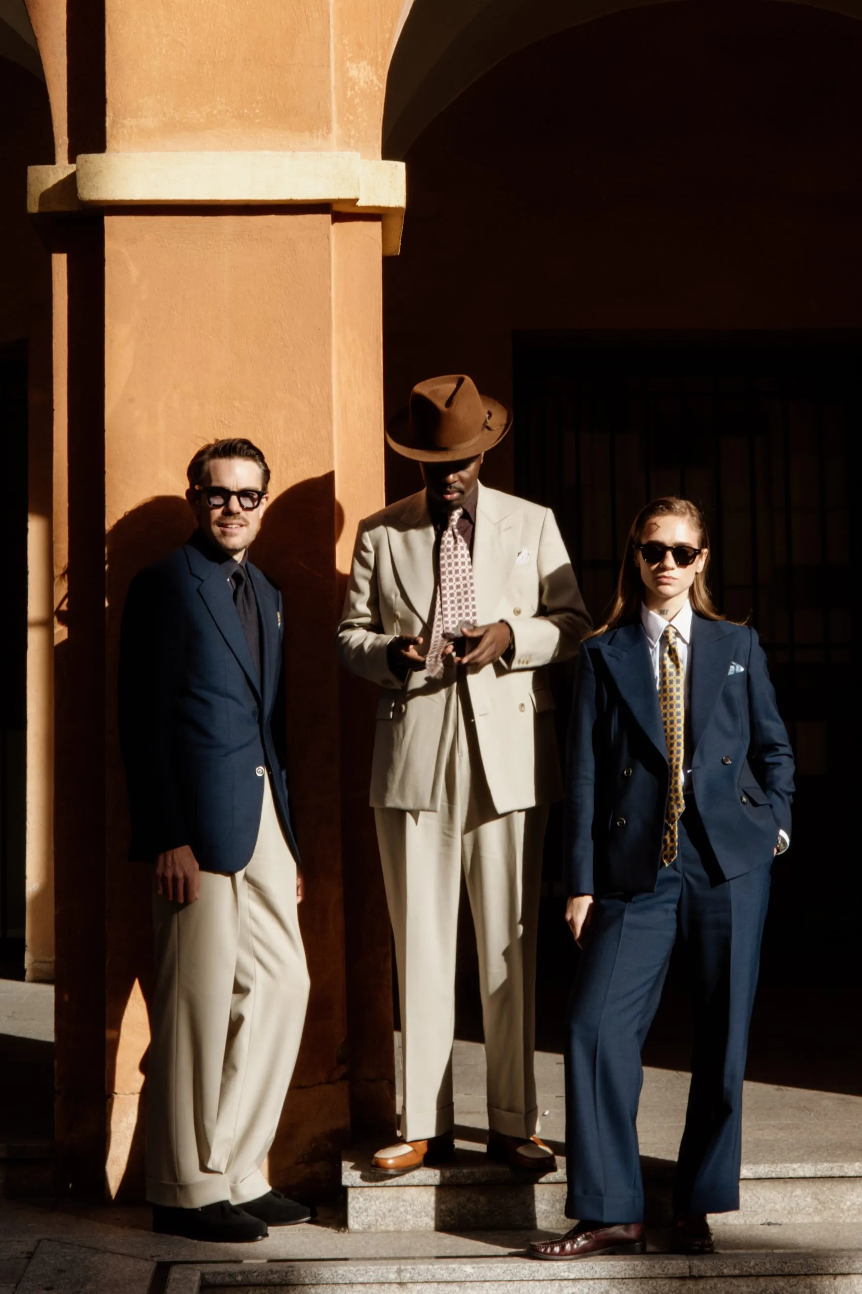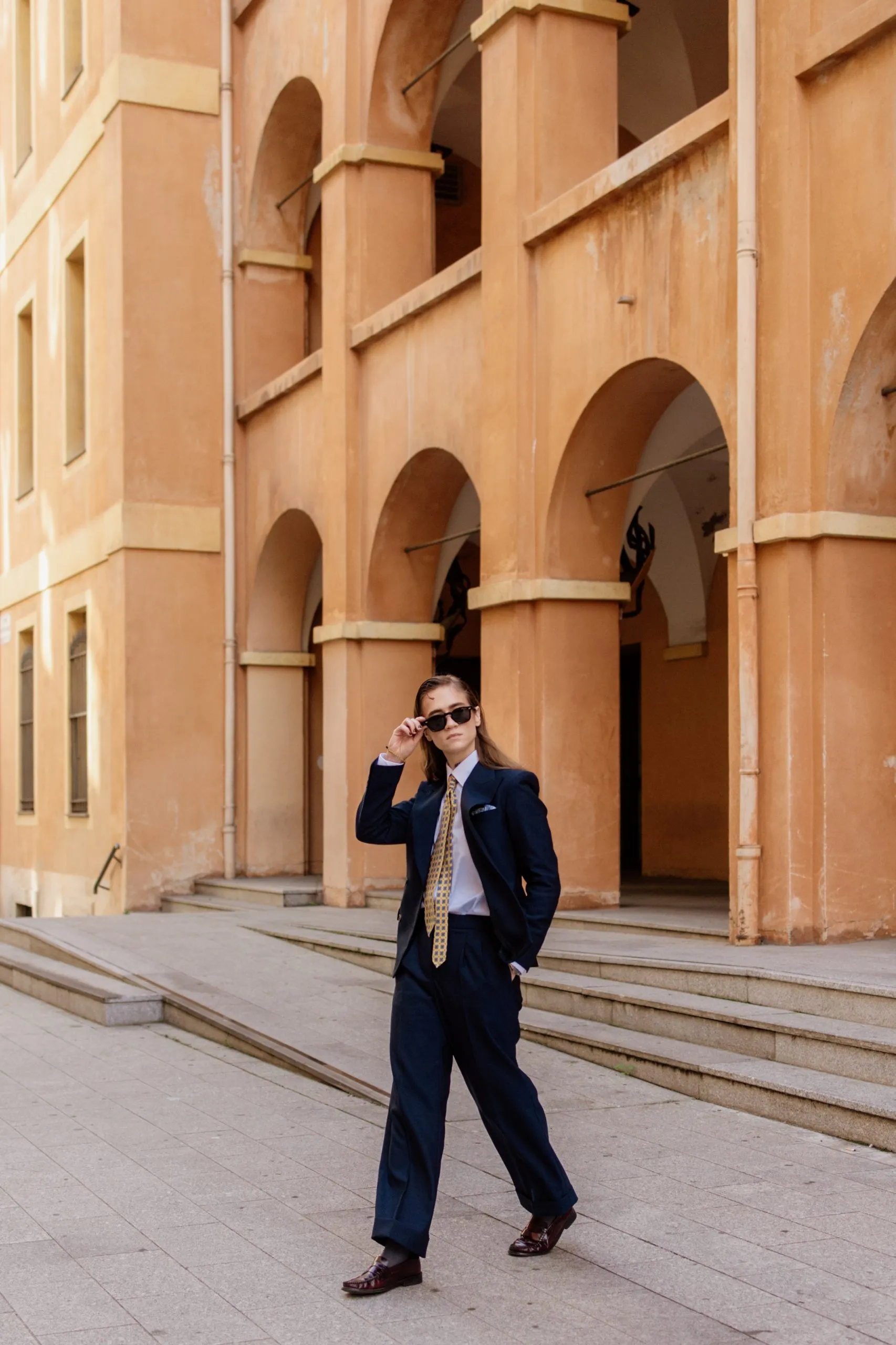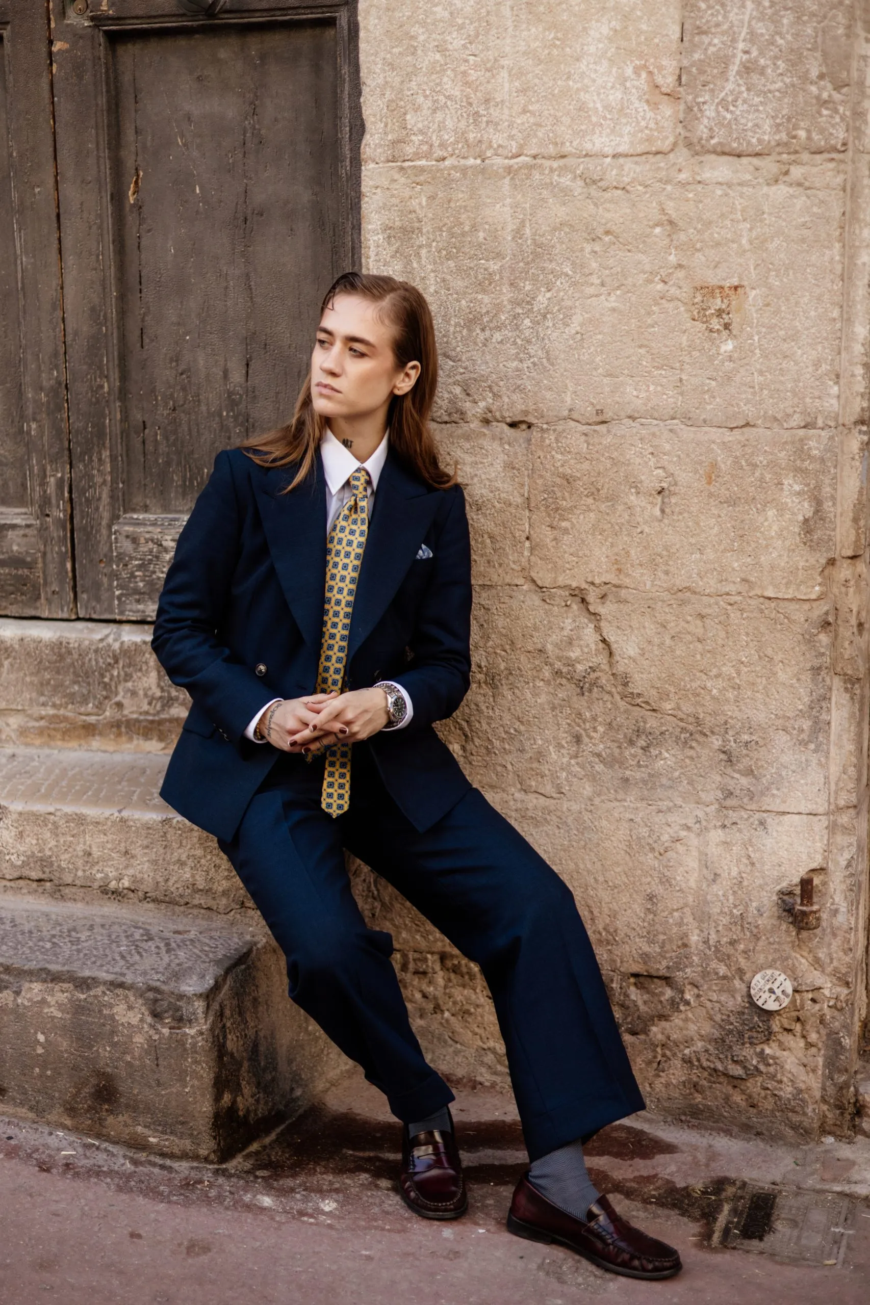 La tenue Sarah, issue de la collection Road to Pitti, incarne une vision moderne du costume féminin sur-mesure. Confectionnée dans un tissu bleu Tonik® Dormeuil 290 g/m², elle associe une veste croisée structurée à un pantalon flare fluide, pour une silhouette affirmée, élégante et facile à porter au quotidien.