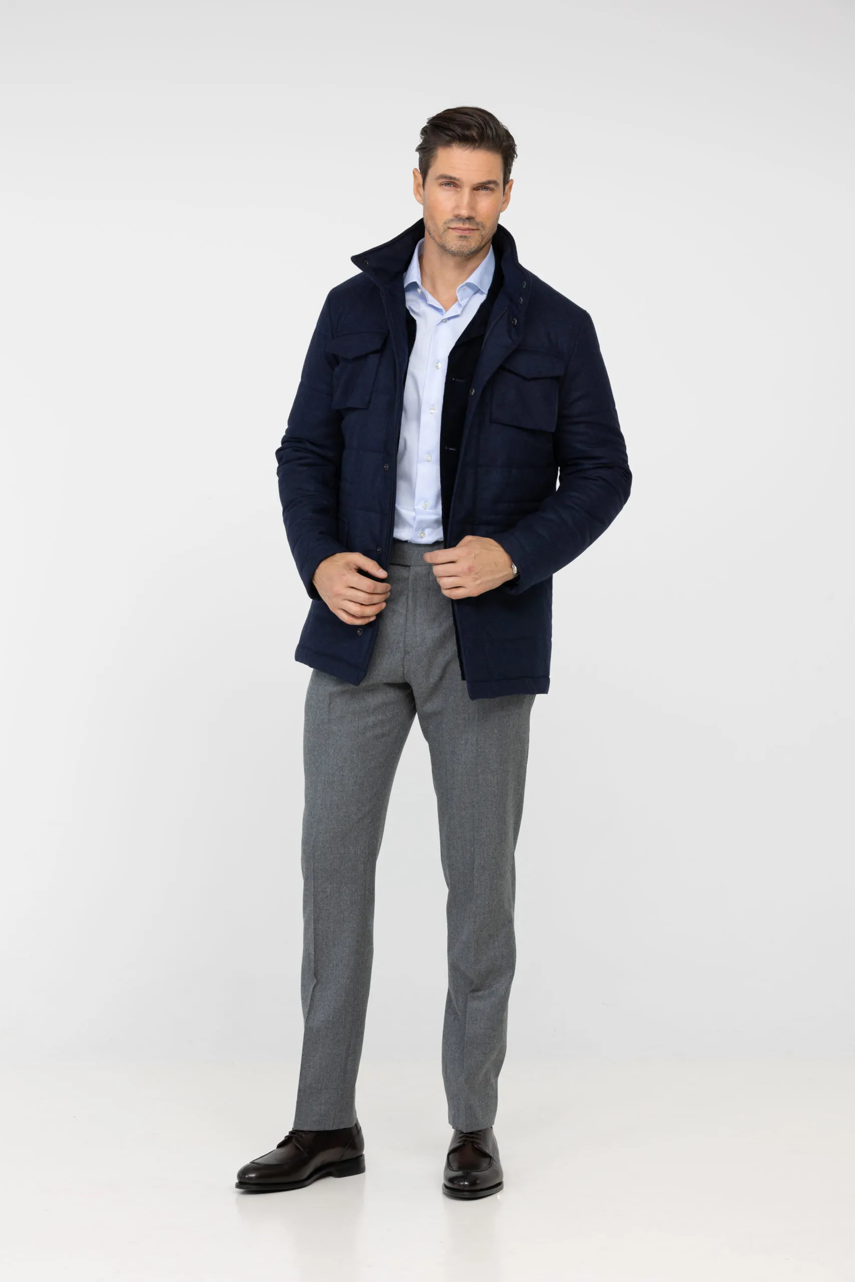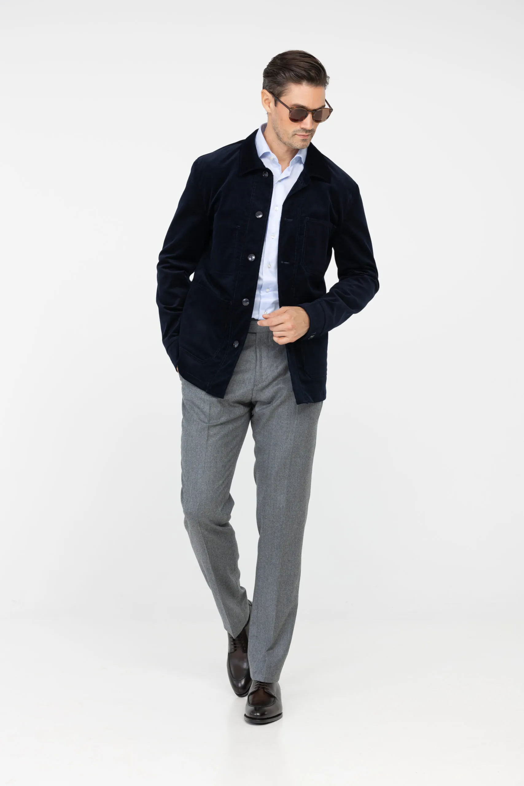 Cette tenue sur mesure dépareillée comprends une chemises en twill bleu clair, un pantalon de flanelle grise et un workwear jacket sur mesure en velour bleu. On peut ajouter un layering avec un manteau matelassé bleu marine pour les températures plus fraiches.