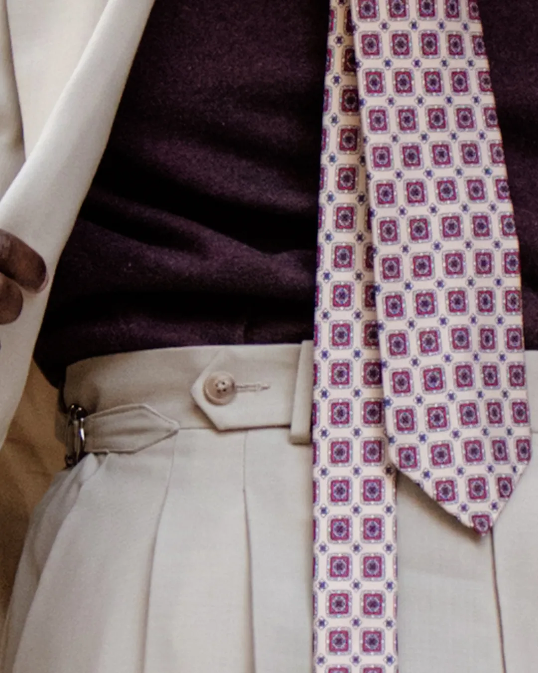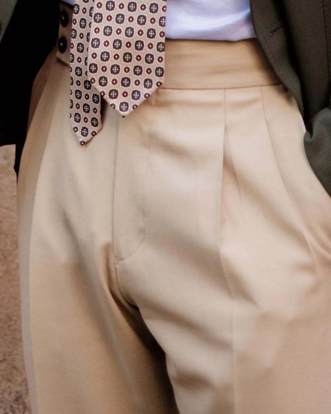Le pantalon à pattes de serrage chevauchantes permet un ajustement précis sans ceinture, alliant praticité et esthétisme. Sa taille haute, sa coupe droite et ses deux plis vers l’extérieur à l’italienne assurent un tombé impeccable sur la chaussure, garantissant à la fois confort et fluidité dans le mouvement.