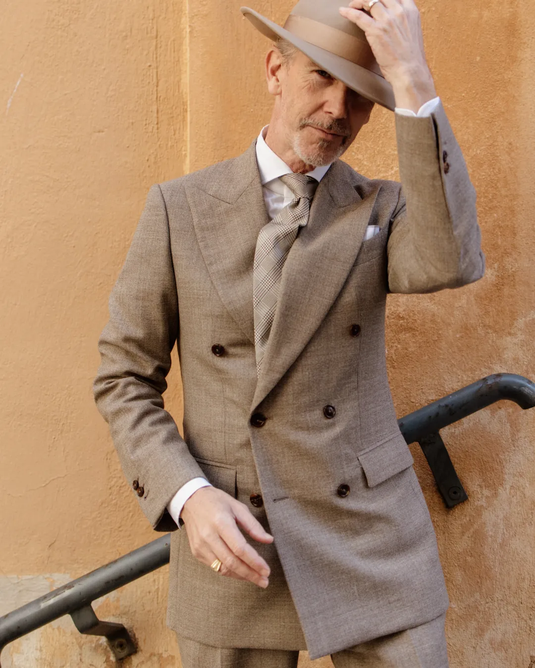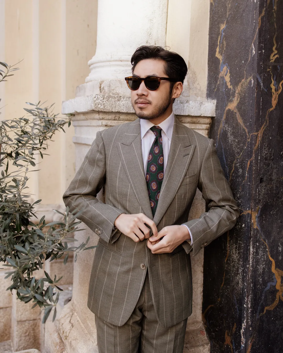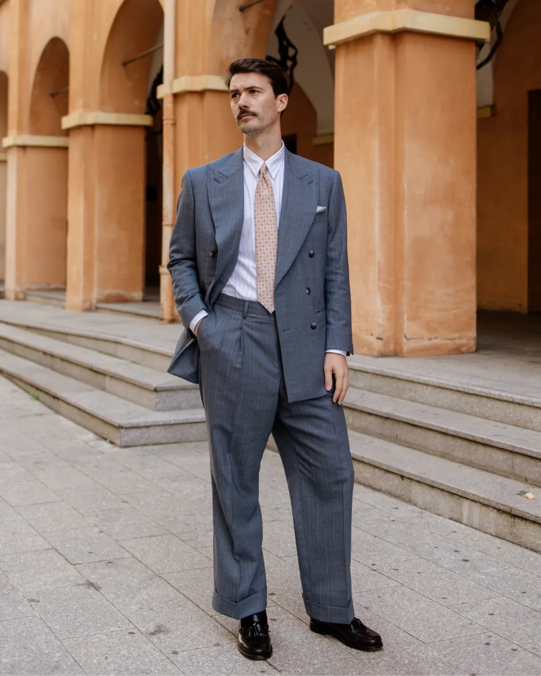 Cette tenue est construite autour du complet croisé, l’un des grands classiques du vestiaire masculin. Le choix d’un cran aigu associé à de larges revers permet de structurer la carrure et d’allonger visuellement la silhouette. Le tissu greige, lumineux et facile à associer, offre une alternative élégante aux teintes plus formelles, tout en restant très polyvalent.