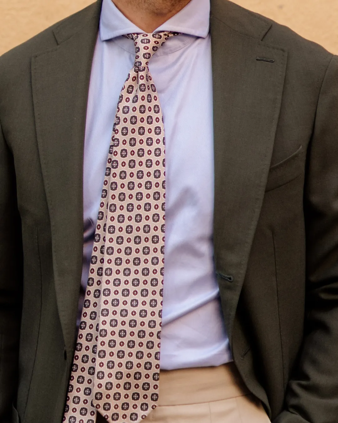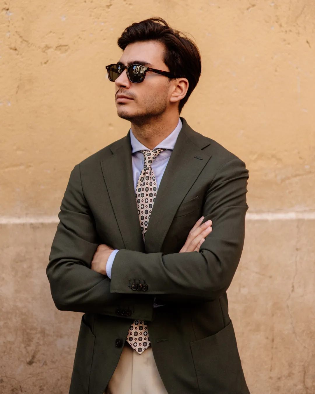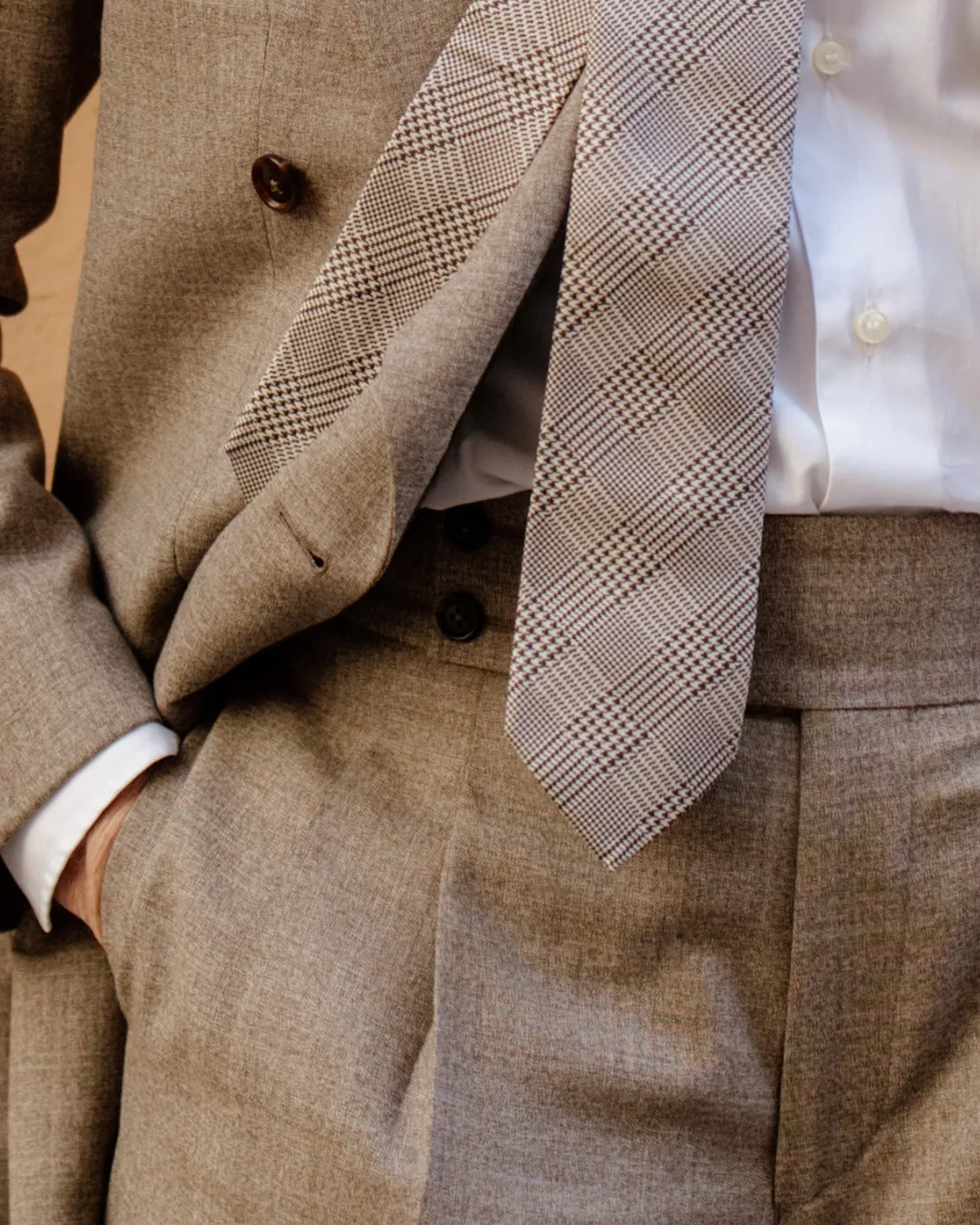 Cette tenue est construite autour du complet croisé, l’un des grands classiques du vestiaire masculin. Le choix d’un cran aigu associé à de larges revers permet de structurer la carrure et d’allonger visuellement la silhouette. Le tissu greige, lumineux et facile à associer, offre une alternative élégante aux teintes plus formelles, tout en restant très polyvalent.