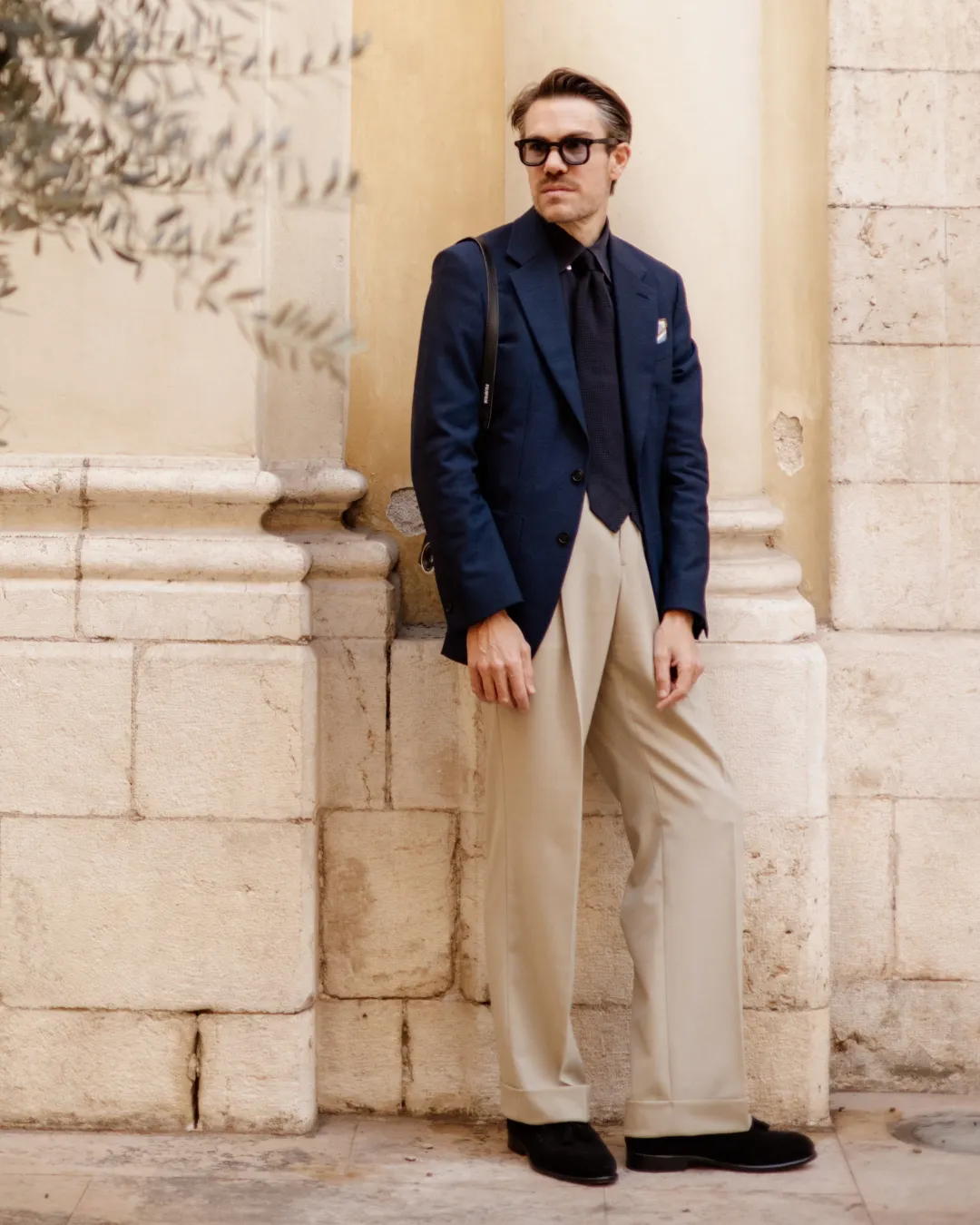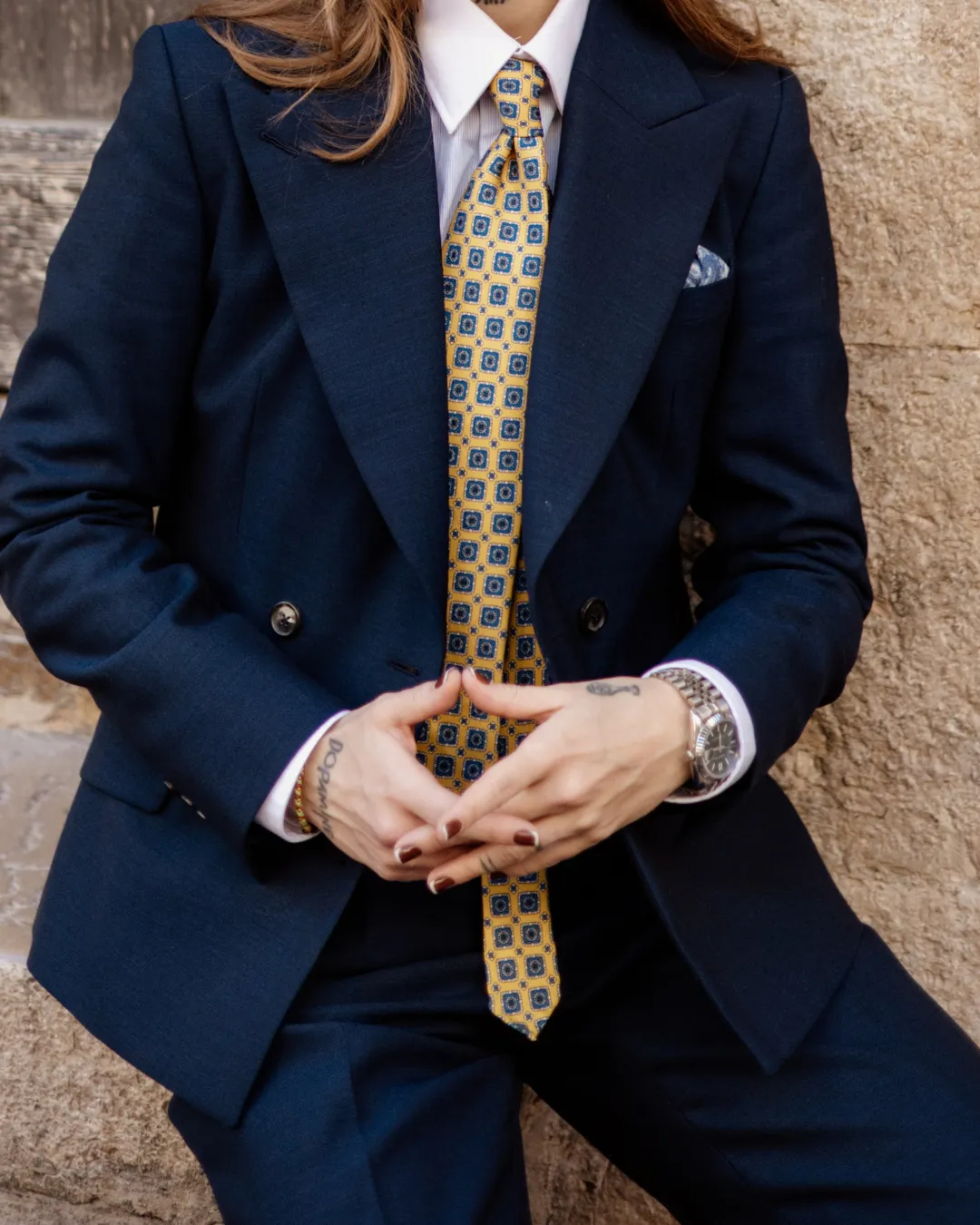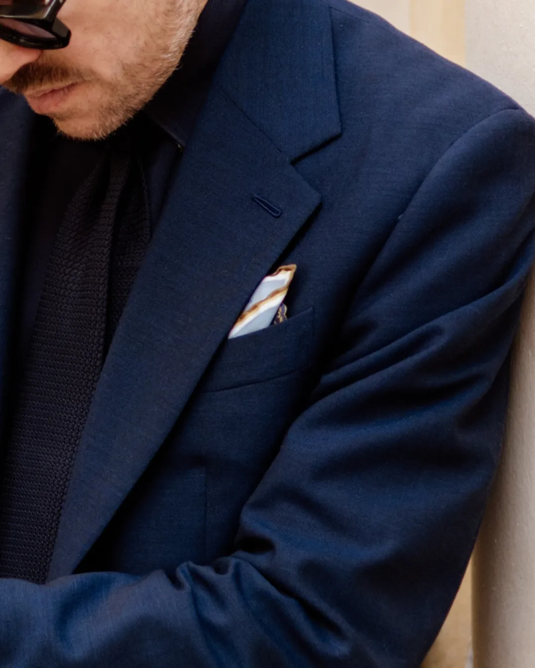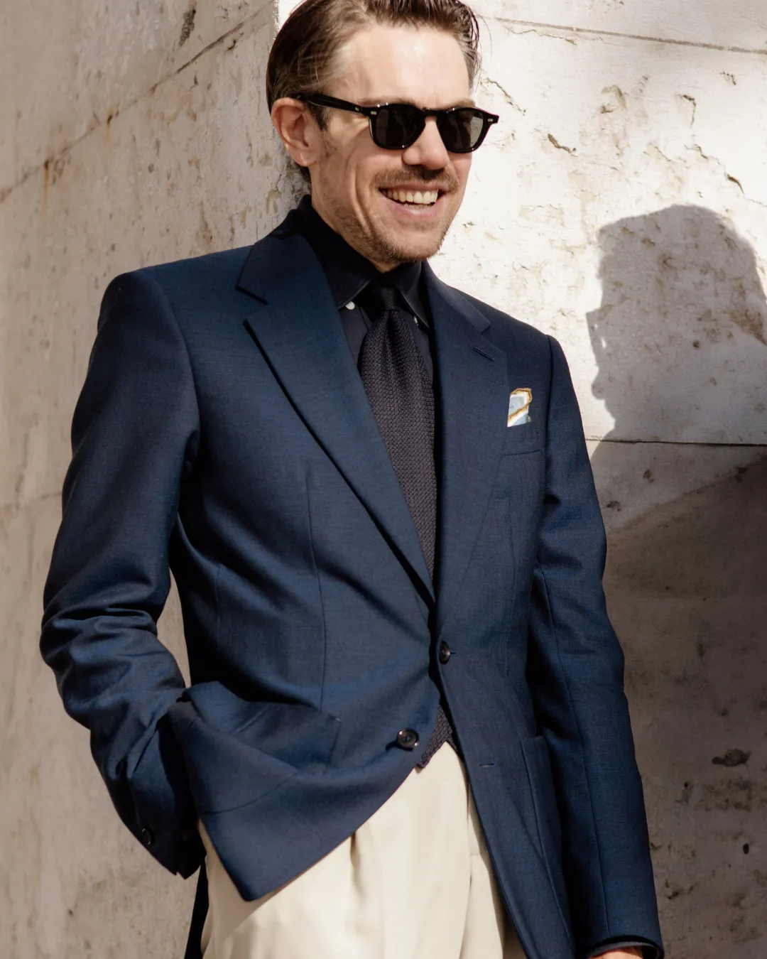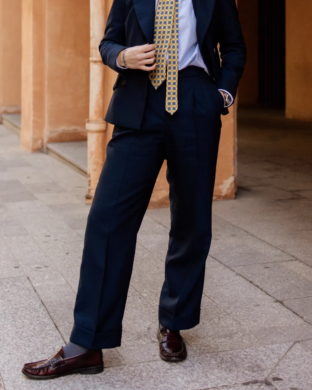 Le tissu bleu marine, identique à celui de la tenue Sarah, illustre la polyvalence d’un même drap Dormeuil, capable de s’adapter aux silhouettes masculines comme féminines. Les poches plaquées et la poche poitrine barchetta ajoutent praticité et sobriété, tandis que le pantalon, à coupe droite avec deux plis vers l’extérieur à l’italienne, structure subtilement la jambe et complète la tenue avec équilibre.