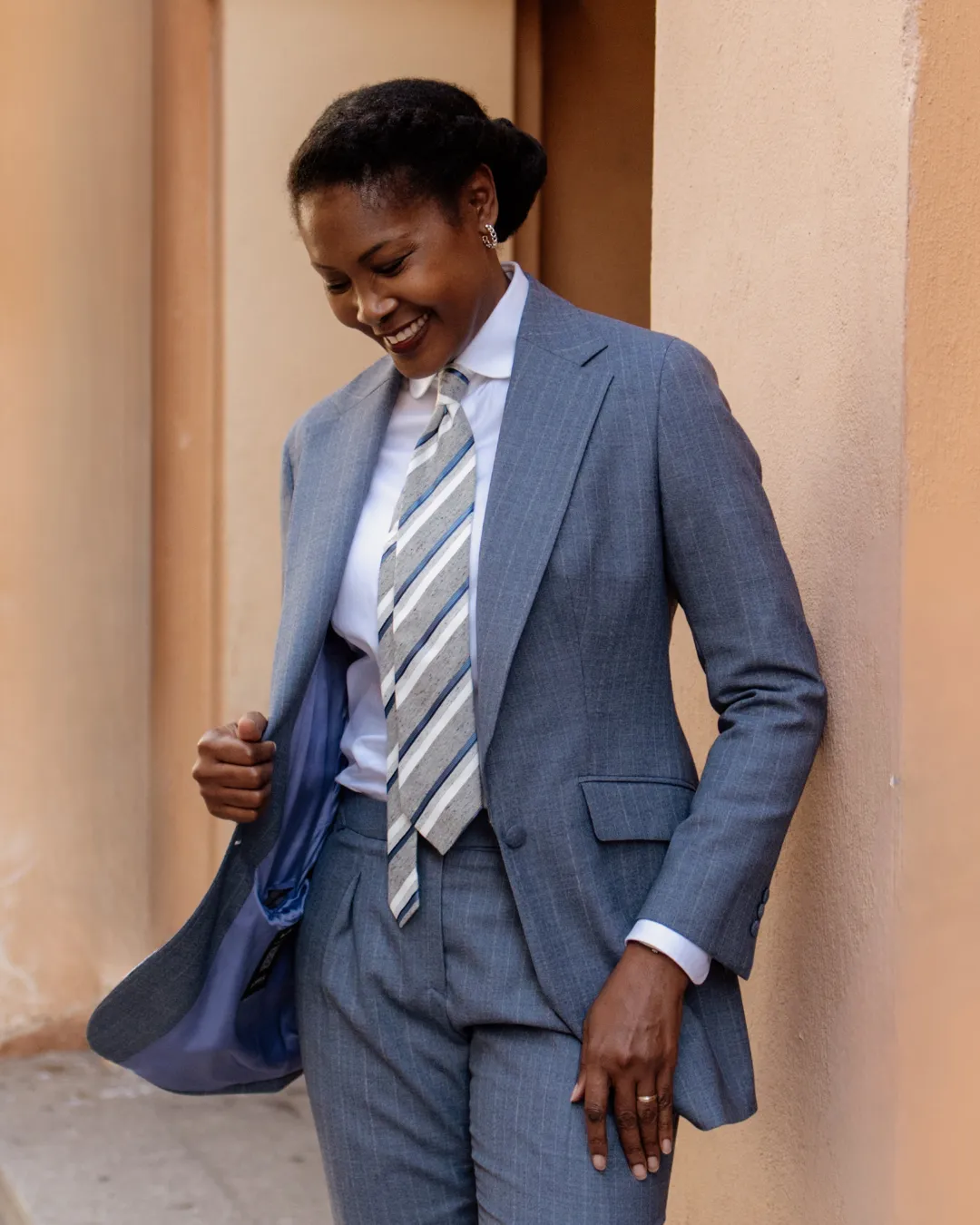 Conçue dans le même tissu que la tenue Jordan Morin, cette version féminine illustre la polyvalence d’un drap Dormeuil, capable de s’adapter à des styles et des coupes variés. La veste présente un bas arrondi, associé à un montage thermocollé, qui lui confère un tombé net et léger. Son cran droit notch lapel apporte une élégance sobre et équilibrée, tandis que les deux poches biais à rabat allient praticité et style discret.