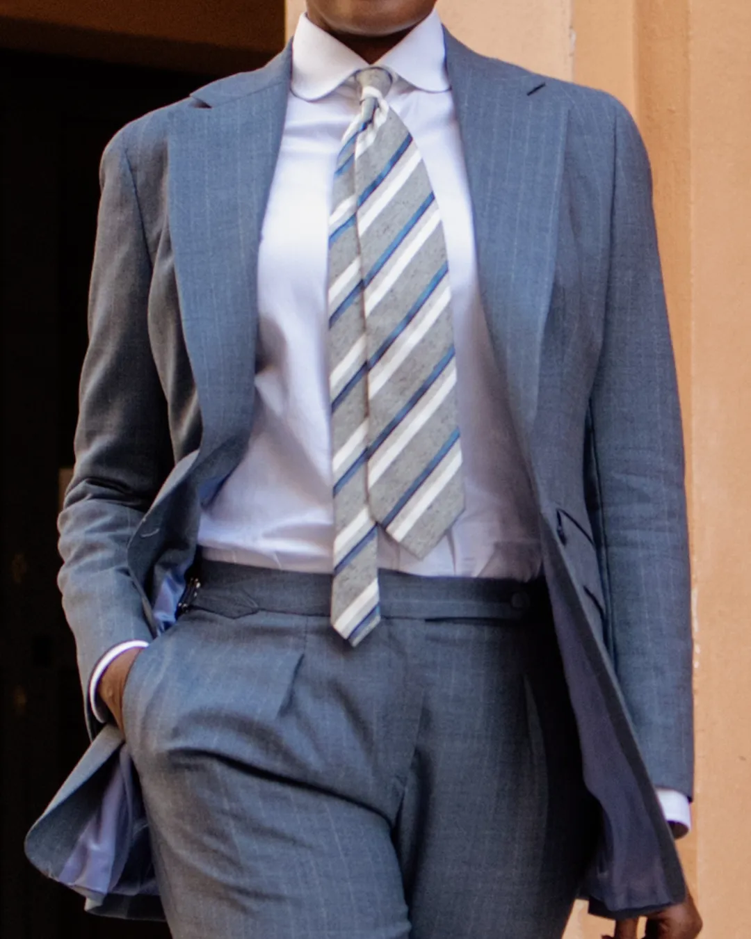 Cette tenue s’adresse à ceux qui souhaitent une silhouette plus marquée et dynamique. Le cran aigu, plus prononcé qu’un cran classique, structure la veste et apporte une allure contemporaine, tandis que les rayures verticales accentuent l’impression de hauteur et d’élancement.