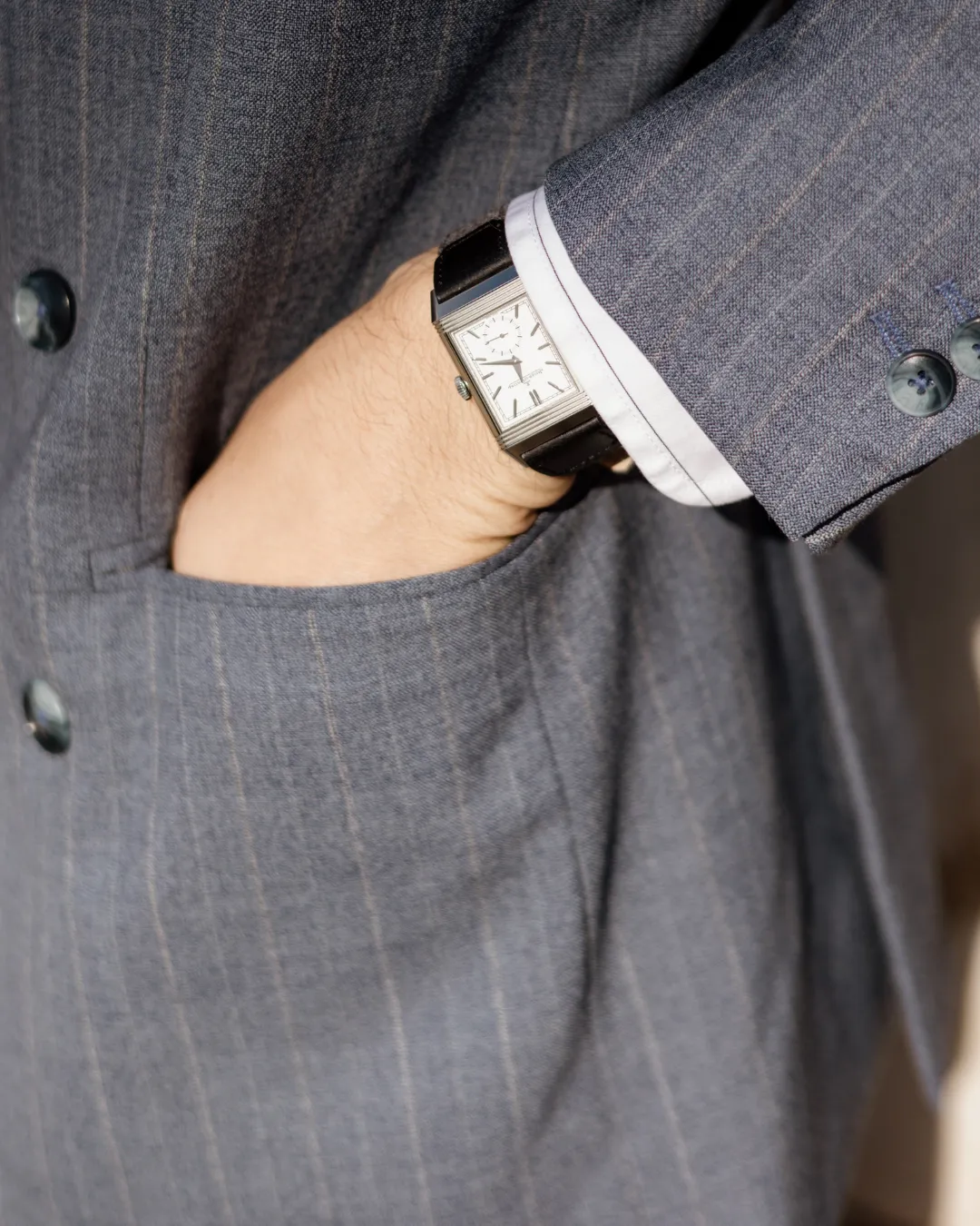 La veste à cran droit avec poches plaquées apporte une allure décontractée, tandis que le pantalon à double boutonnage, doté d’une fermeture décalée et de deux plis vers l’extérieur à l’italienne, conserve une structure élégante et nette. Ce type d’assemblage montre comment le tailoring peut s’adapter à différents styles, en permettant de mélanger et assortir des pièces pour créer des looks uniques et contemporains.