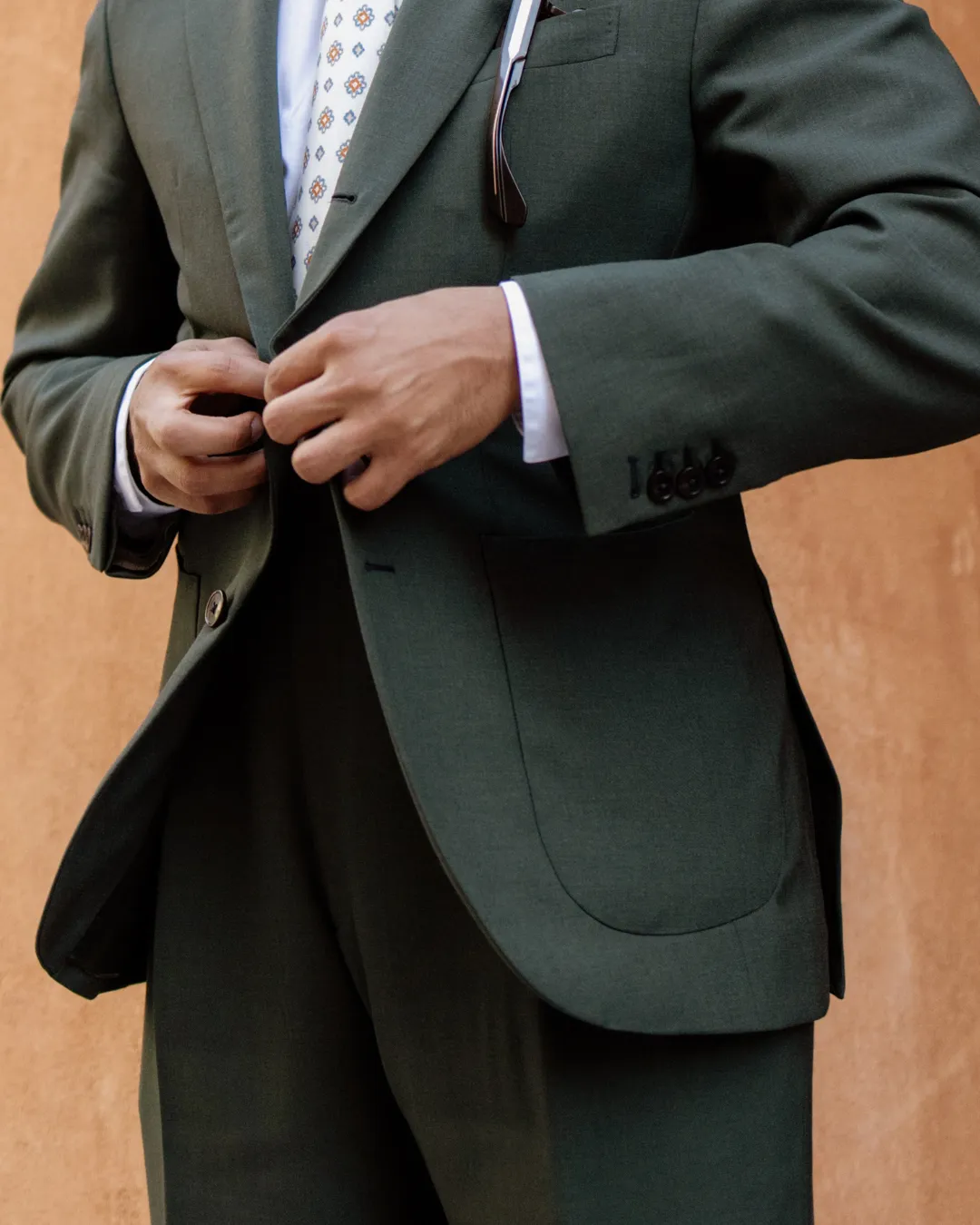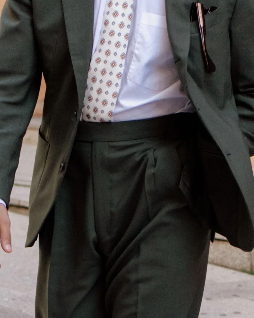 Les poches plaquées renforcent l’esprit casual chic, tandis que le pantalon à plis italiens, avec deux plis vers l’extérieur, conserve une vraie élégance et une ligne nette. La couleur verte, lumineuse mais subtile, permet de dépareiller facilement la tenue en l’associant à d’autres pantalons ou vestes de la collection (comme la Tenue Ivan), pour un rendu plus décontracté et moderne, tout en gardant cohérence et style.
