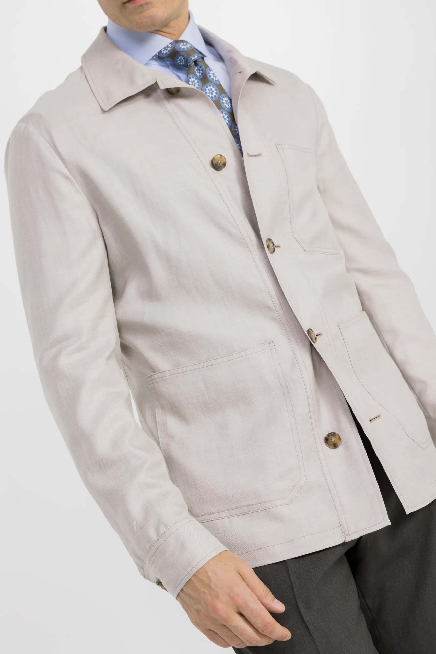 Notre version est réalisée dans un tissu signé Piacenza, mêlant laine, soie et lin (180 g/m). Extrêmement léger, il offre un tombé souple et une grande respirabilité idéale lorsque les températures remontent mais que les matinées restent fraîches. Aujourd’hui, sa coupe droite, son col classique workwear et ses trois poches plaquées lui donnent un caractère authentique, tandis que ses finitions soignées comme les boutons en uréa brun intermédiaire et doublure limitée aux manches qui garantit confort et légèreté. Portée sur le costume ou dépareillée, elle structure la silhouette sans la rigidifier.