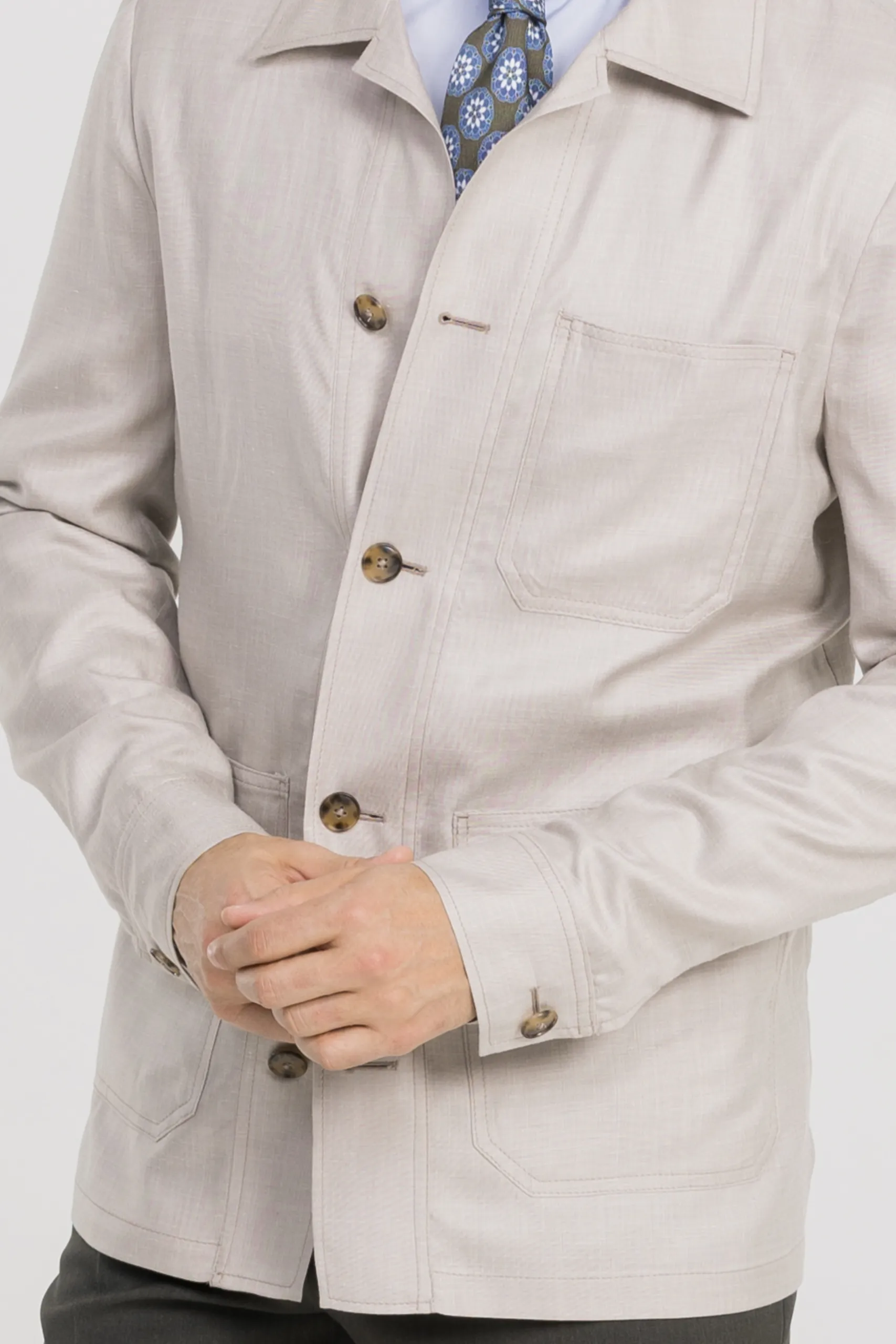 La veste, semi-entoilée, présente un revers cran droit de 9 cm et des épaules napolitaines pour une ligne naturelle, souple et élégante. Les poches plaquées légèrement arrondies renforcent l’équilibre entre formel et décontracté.