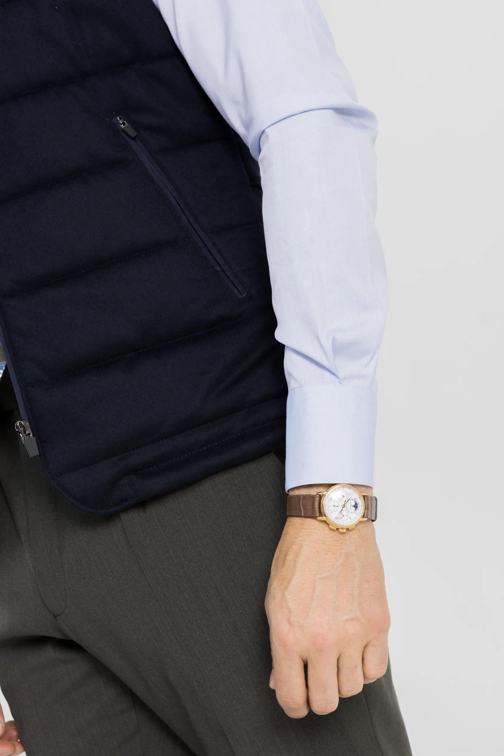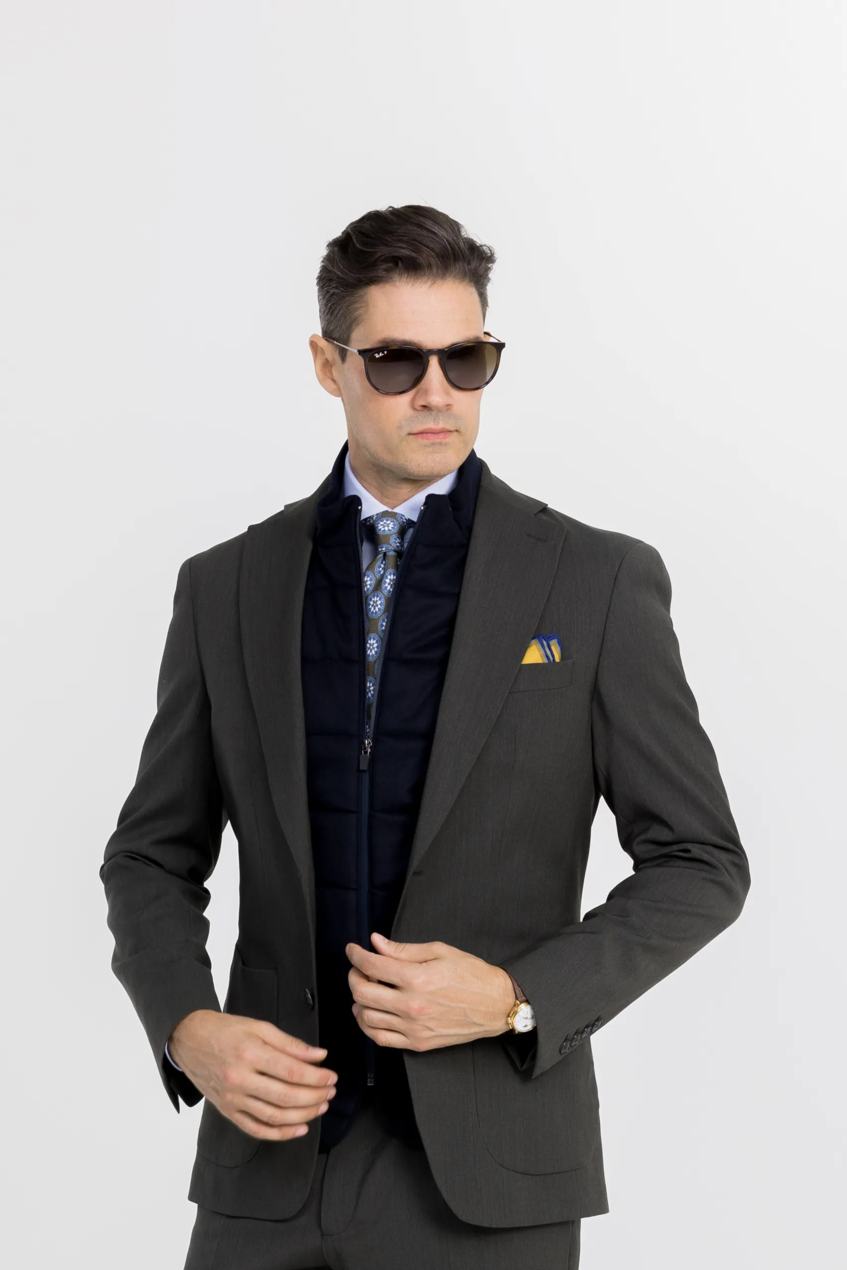 Au cœur de cette silhouette, un costume vert vintage Marzotto, profond et nuancé, réveillé par la fraîcheur d’une chemise bleu ciel et enrichi par des superpositions légères : un gilet matelassé Piacenza et une work jacket beige aux accents artisanaux. Une tenue conçue pour l’homme, qui navigue entre rendez-vous professionnels et instants plus libres, sans jamais compromettre son élégance.