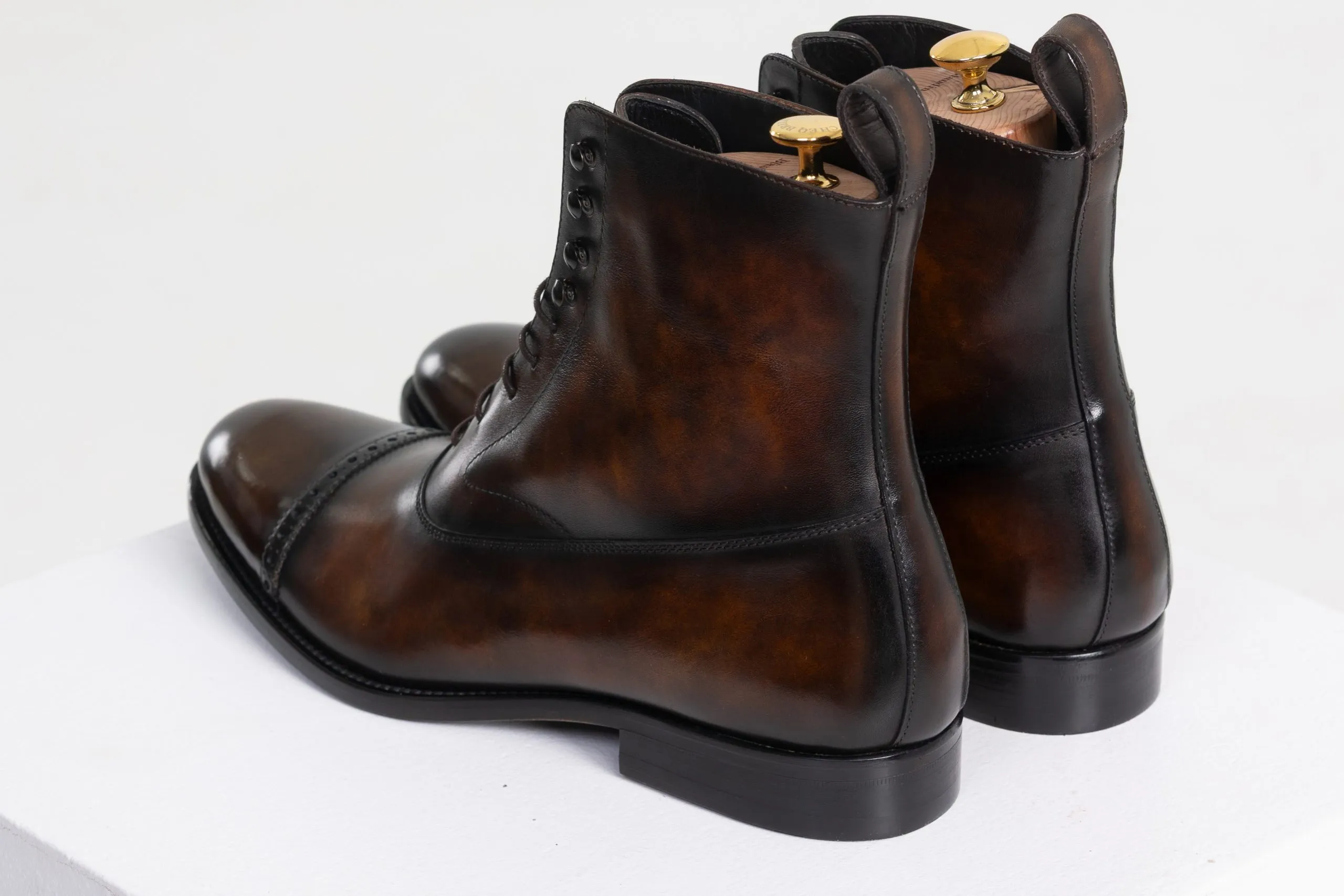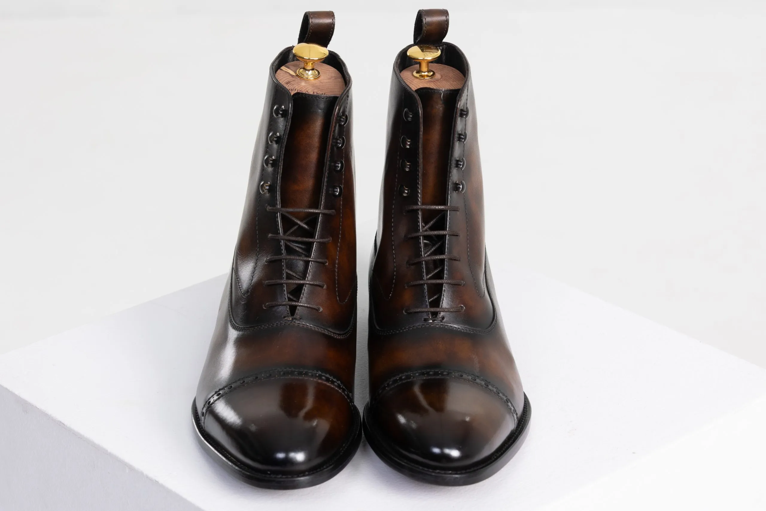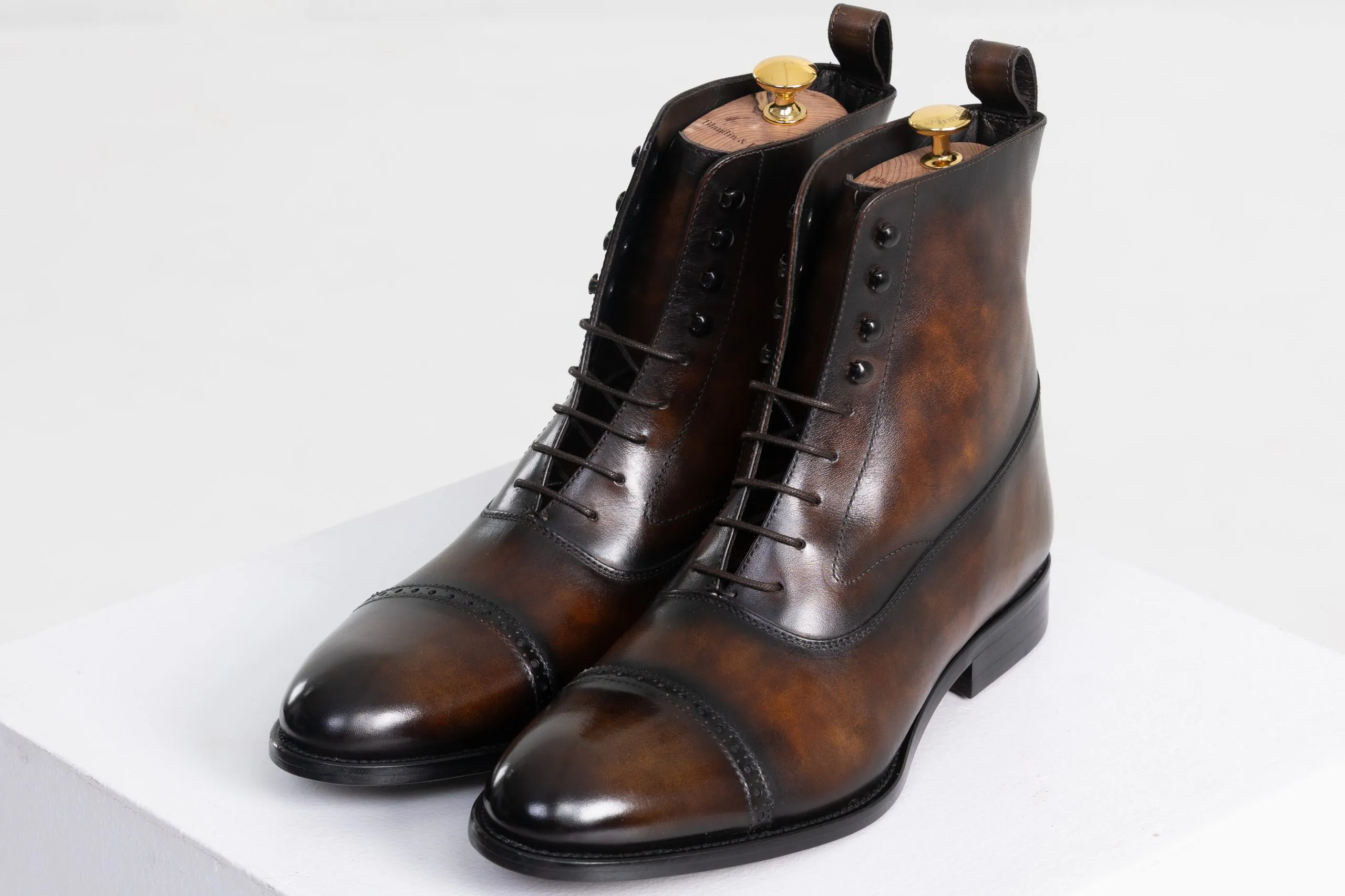 Des Balmorals montées en Goodyear, patinées à la main dans une teinte tabac profonde, avec semelle bicolore et cambrion intégré : un essentiel du vestiaire masculin, entre rigueur classique et détails raffinés.