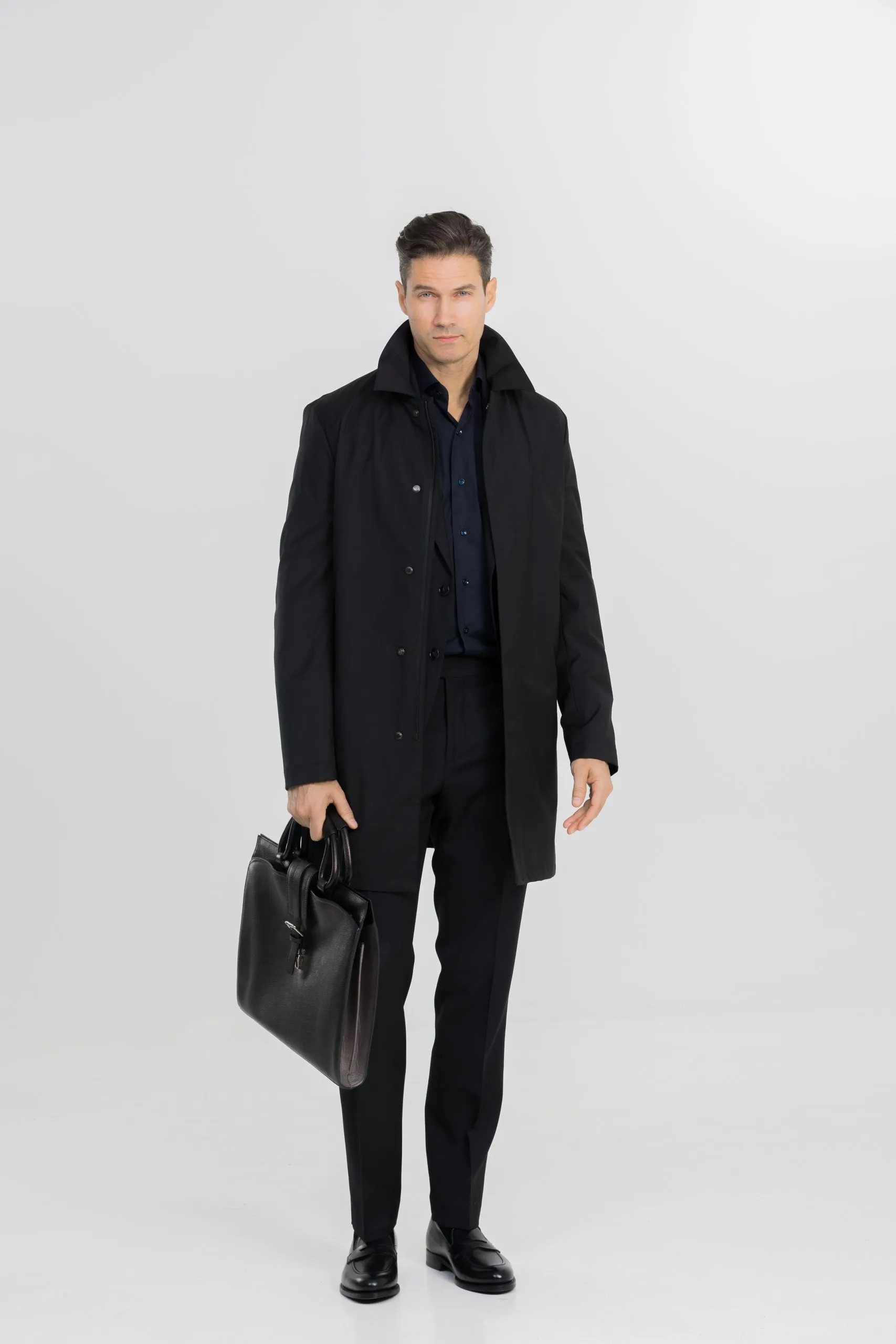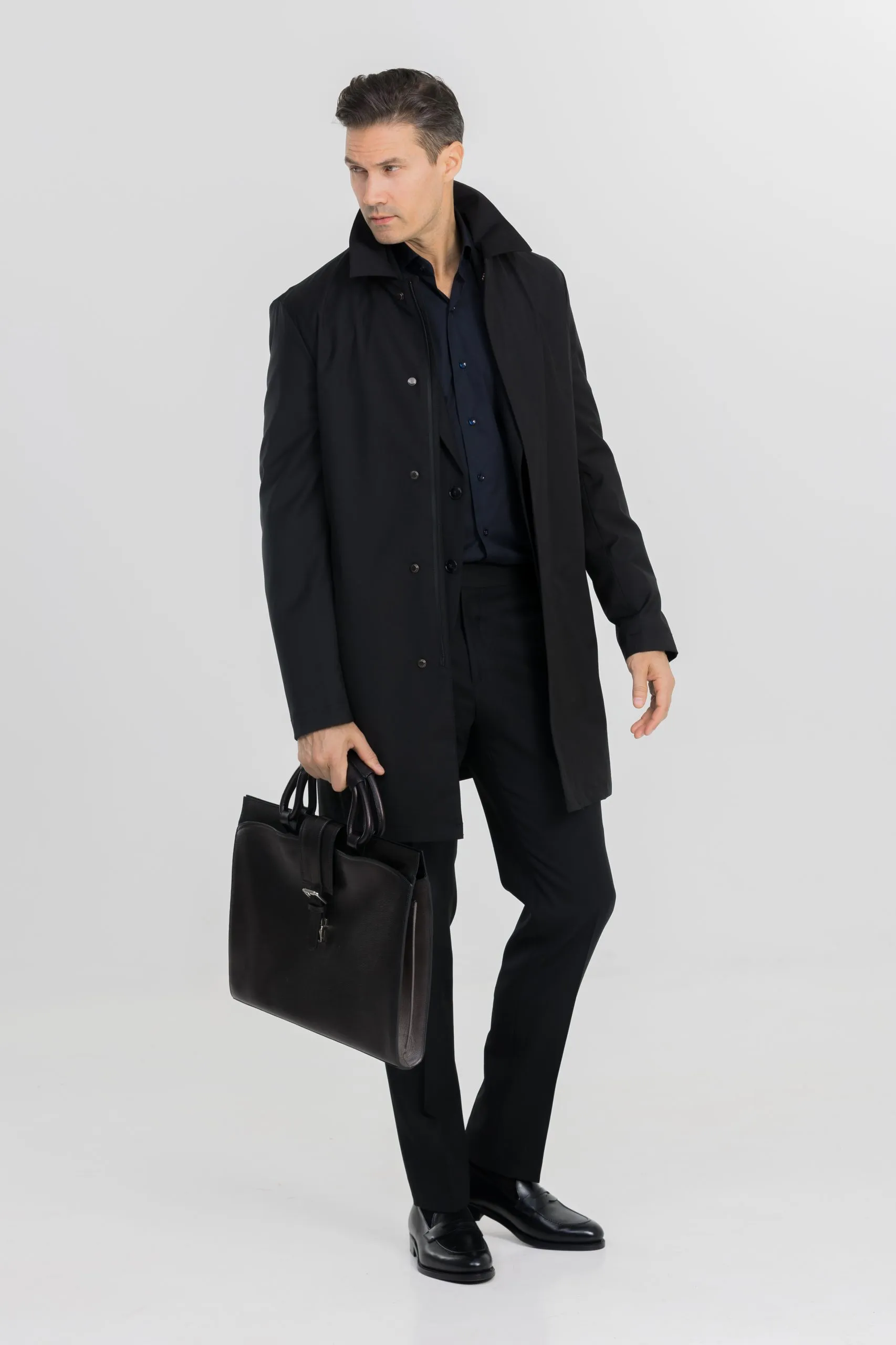 Découvrez notre carcoat noir sur mesure en tissu technique Loro Piana, un manteau pensé pour l’homme urbain. Inspiré des automobilistes du début du XXᵉ siècle, il allie liberté de mouvement et protection contre le froid et l’humidité. Sa coupe courte et sa teinte noire en font une pièce polyvalente : portée sur un costume ou un pantalon casual, elle s’associe facilement à une écharpe en laine, des gants en cuir ou des bottines élégantes.