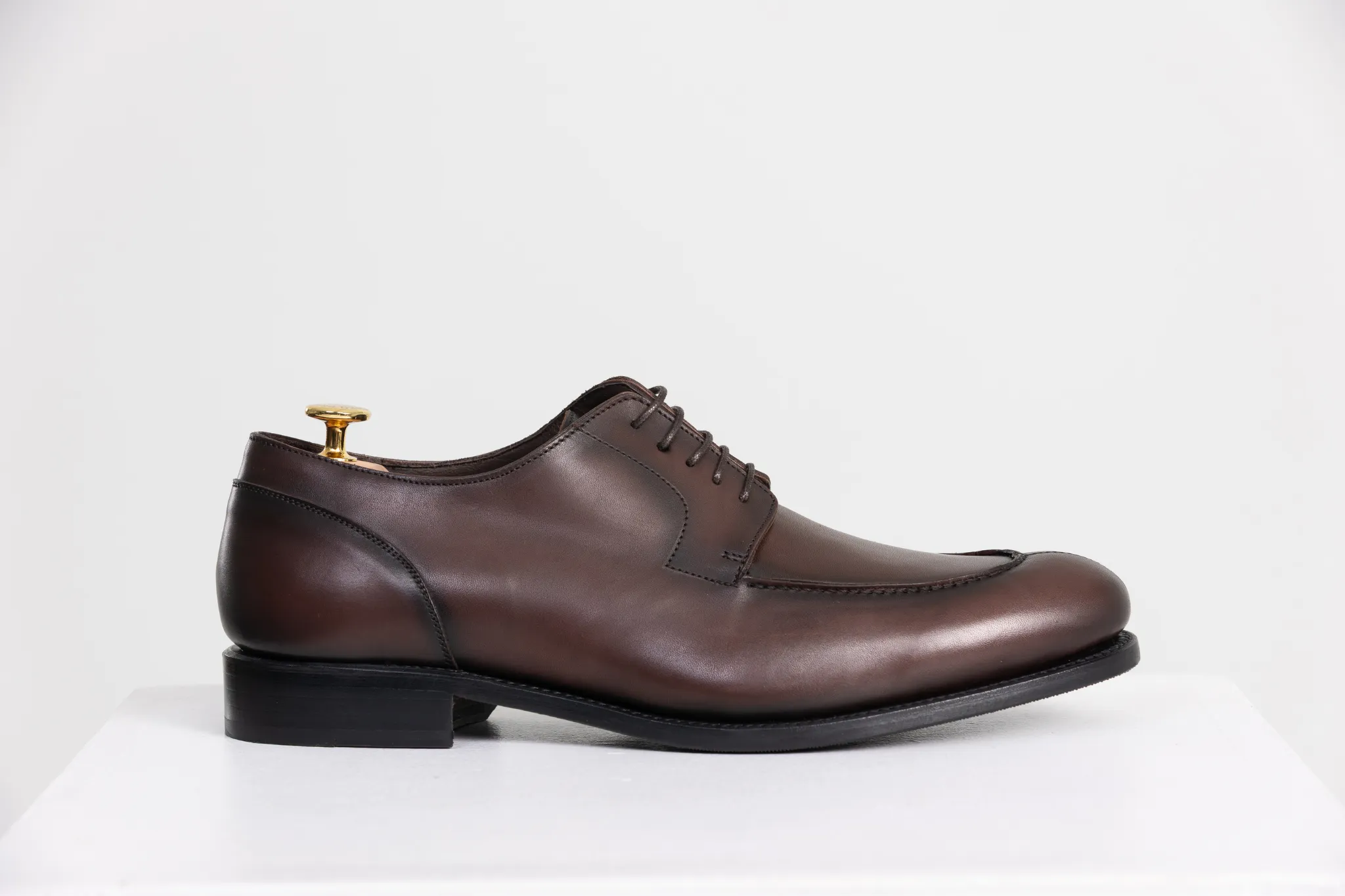 Des derbies montées en Goodyear, conçues dans un cuir brun foncé patiné et rehaussées d’un design split toe : un indispensable du vestiaire masculin, entre tradition et modernité.