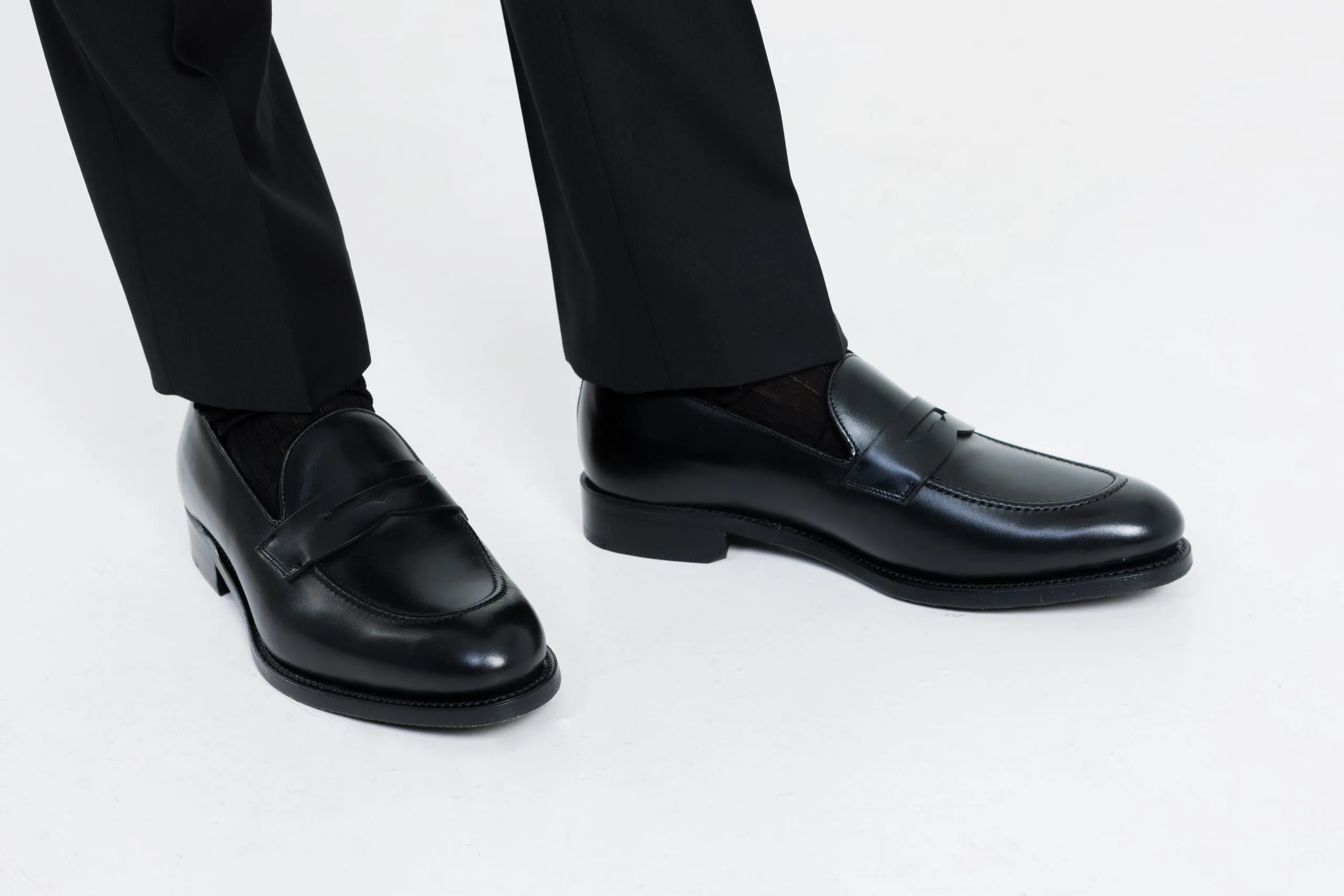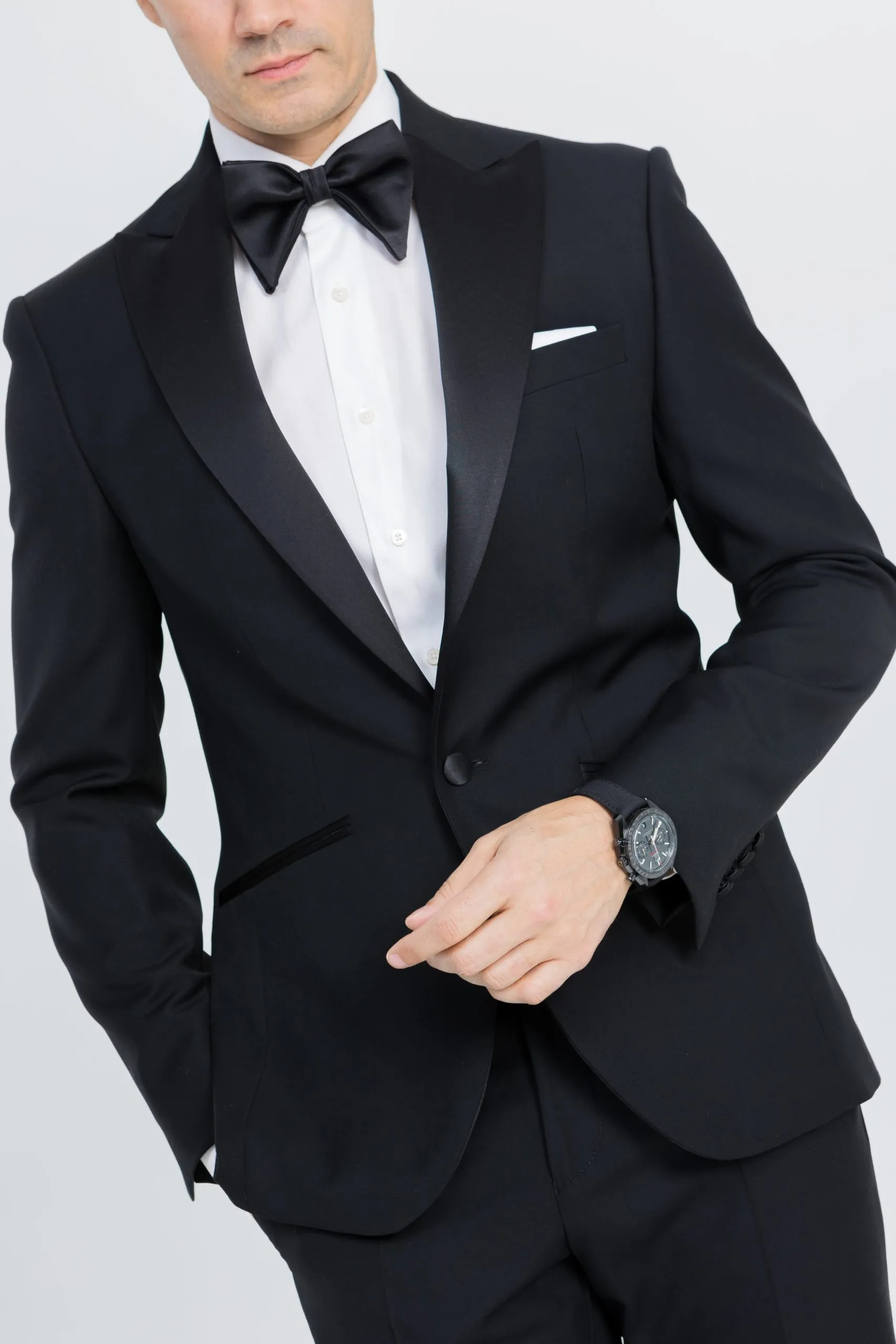 Le pantalon présente une patte de fermeture rallongée, des patte de serrage asymétriques permettant un ajustement précis sans ceinture, ainsi que des poches avant italiennes en biais et deux poches dos passepoilées. Le bas sans revers en biais assure une finition nette et élégante, parfaitement adaptée au registre formel du smoking.