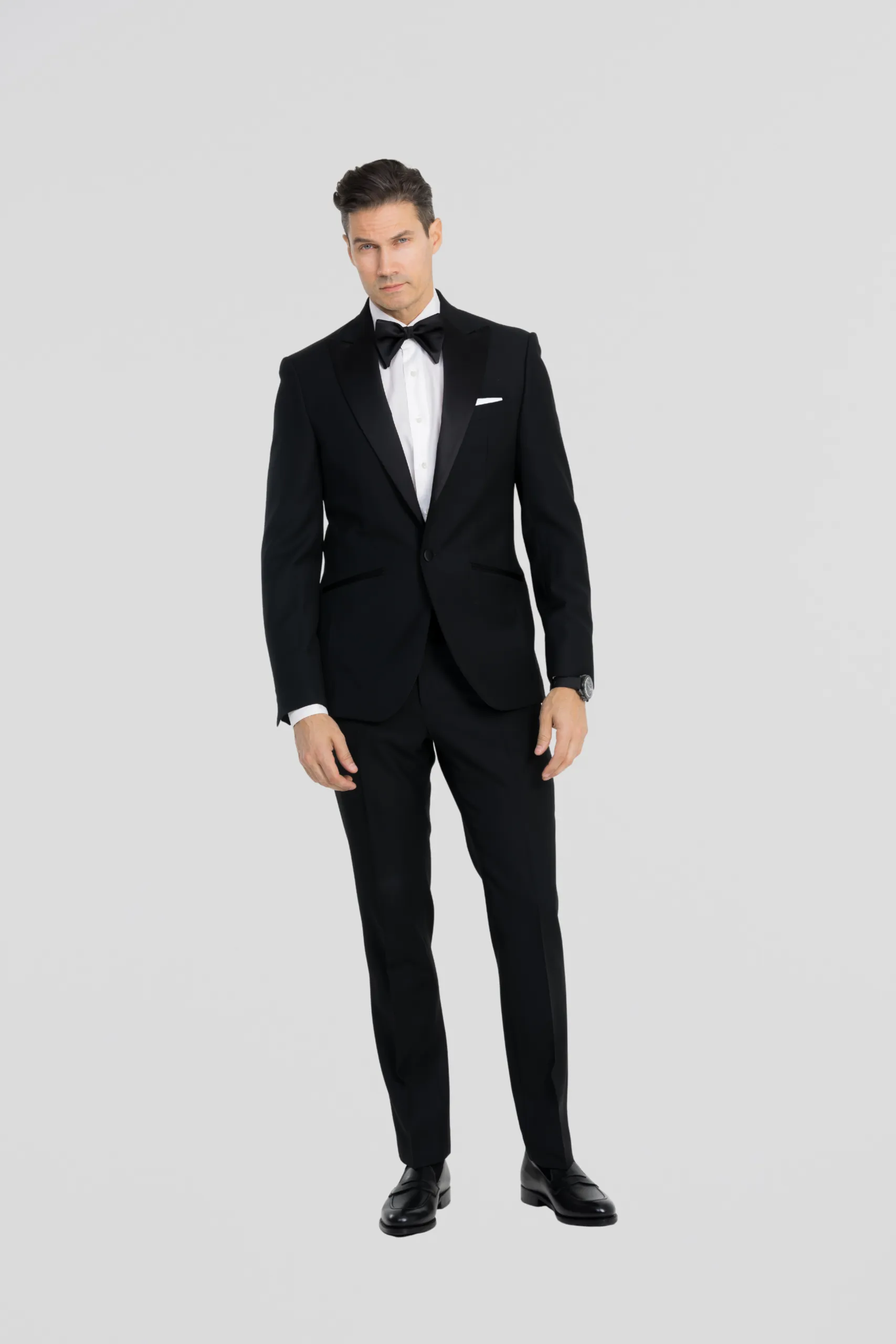 La veste de ce smoking est dotée de revers à cran aigu de 9,5 cm, apportant une touche affirmée et élégante. Le montage semi-entoilé garantit un bon maintien tout en laissant le vêtement vivre avec le temps.