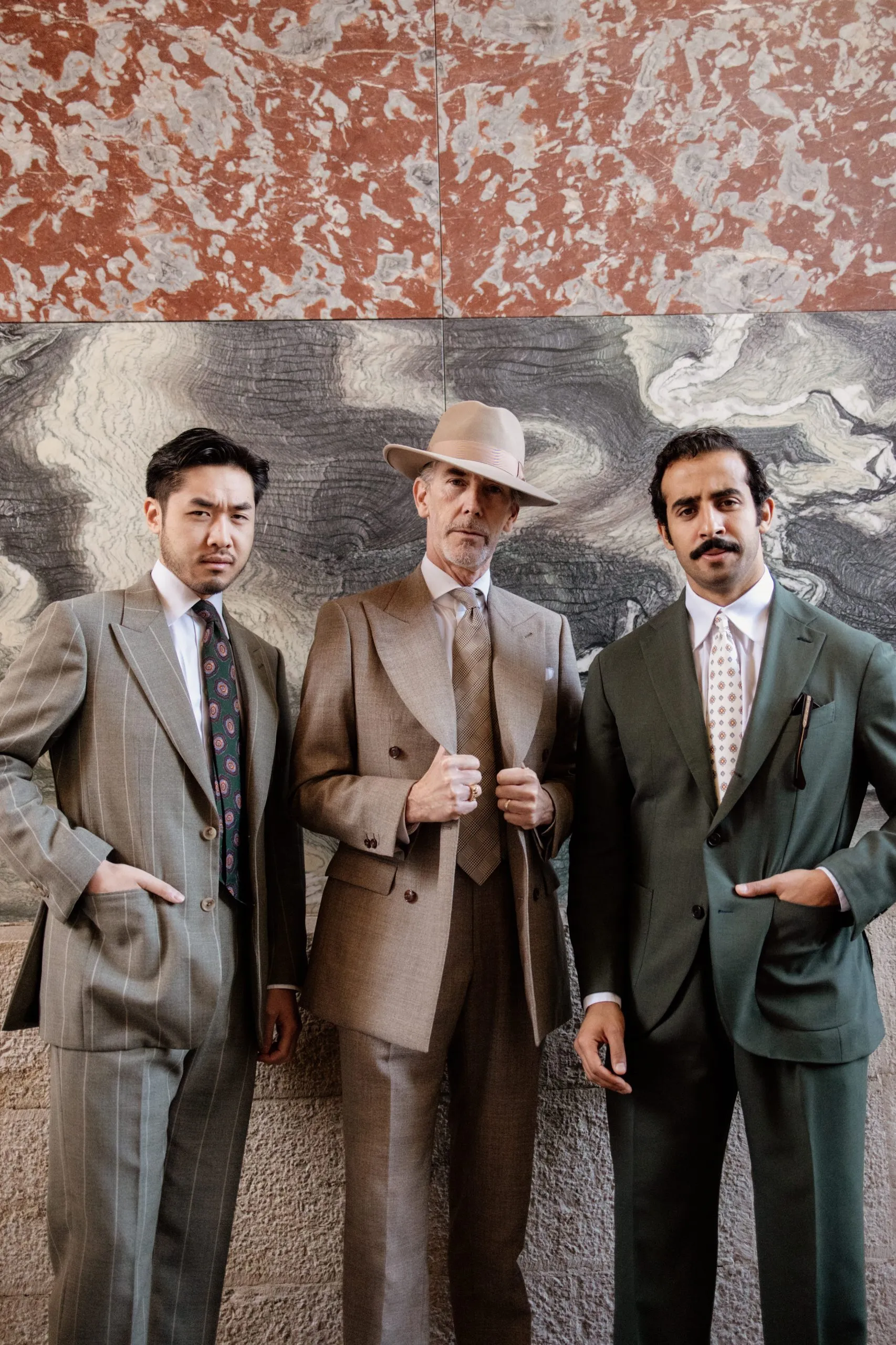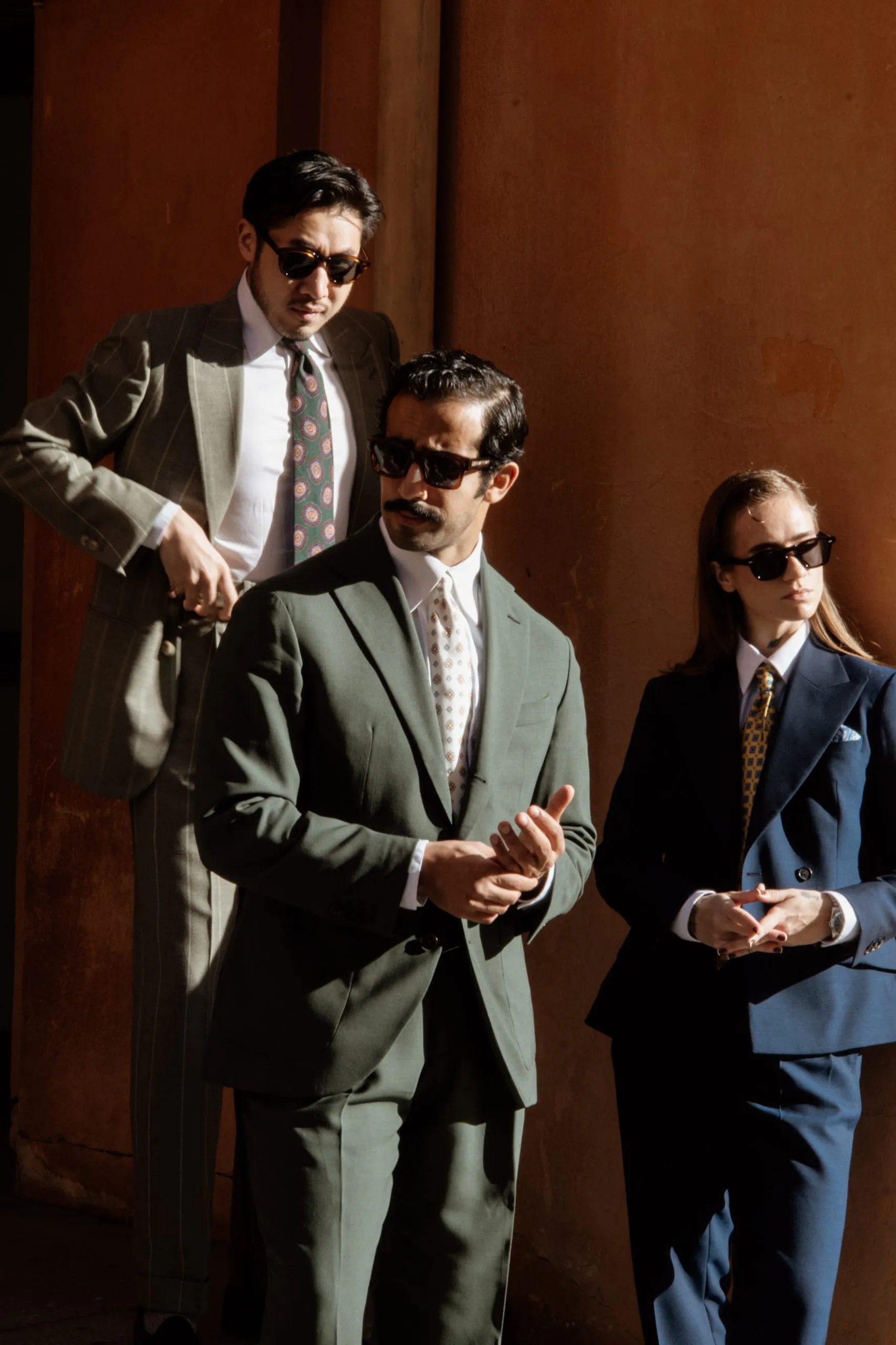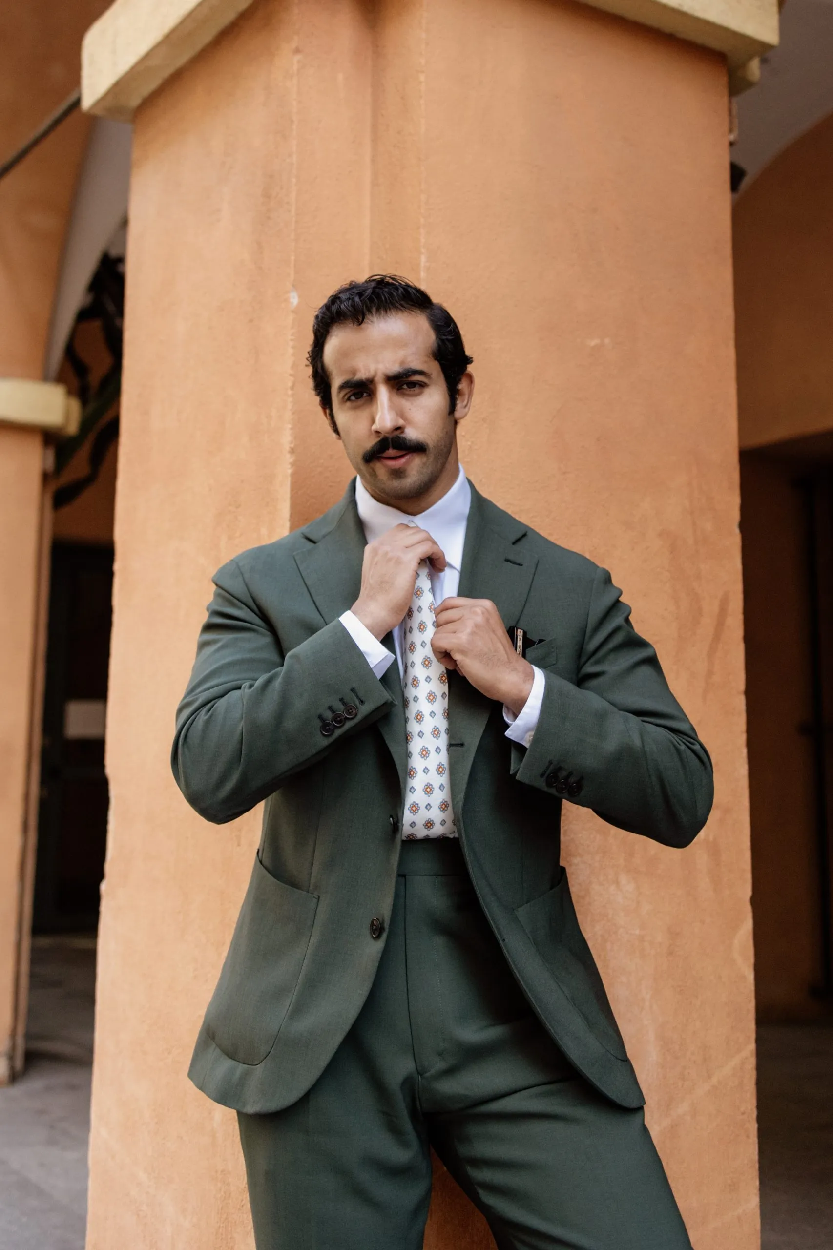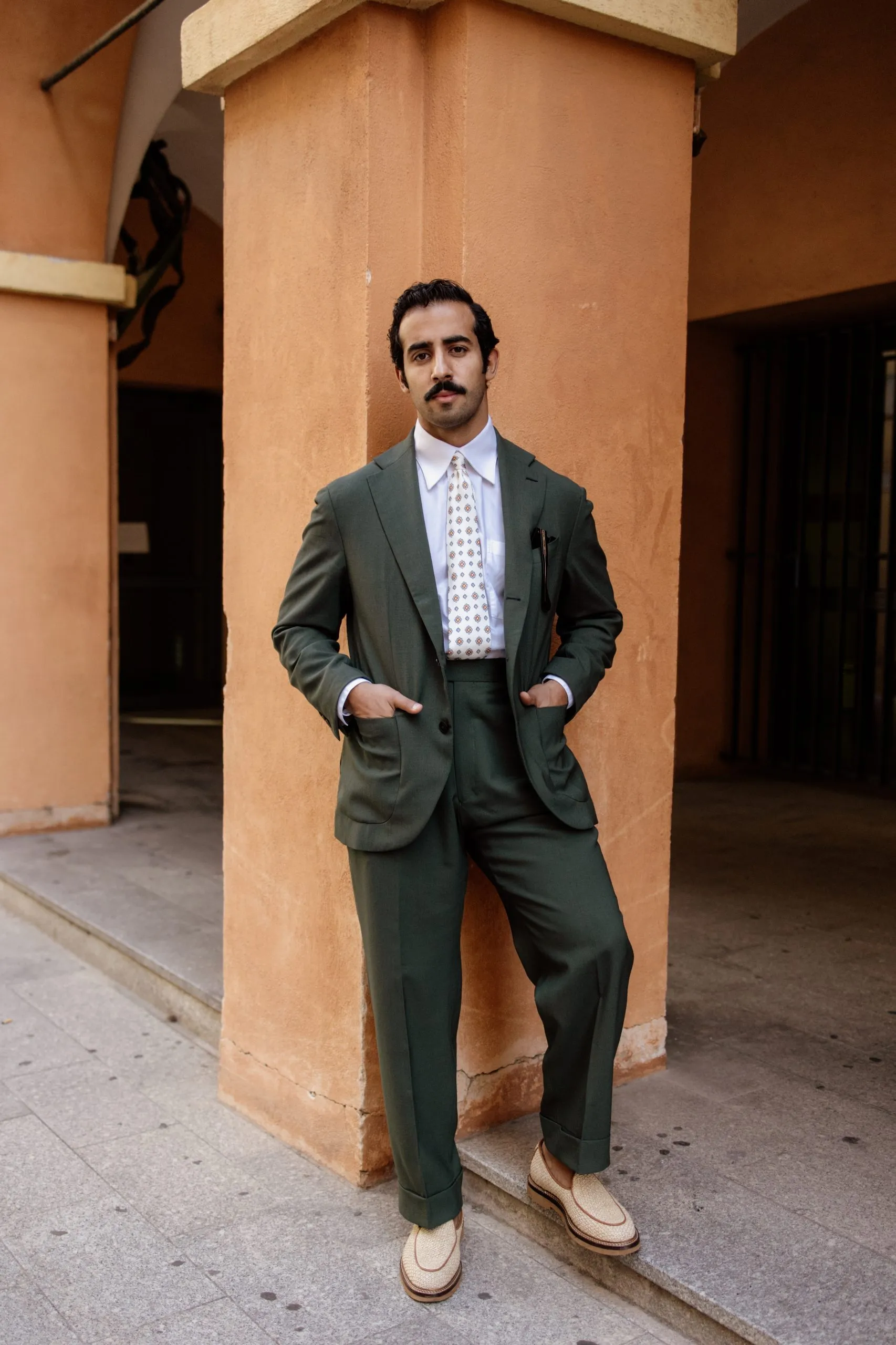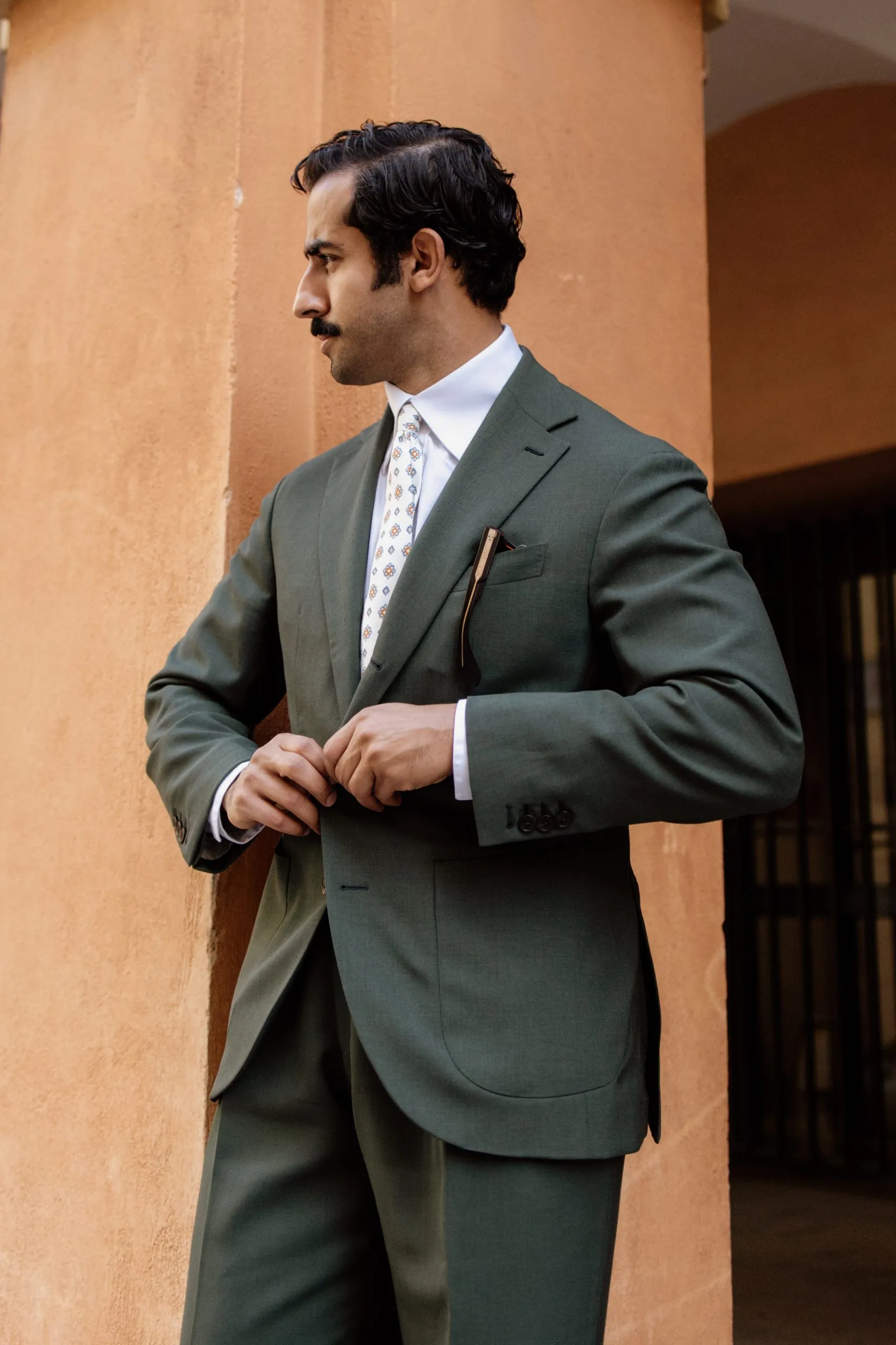 Cette tenue verte fait partie de la collaboration Road to Pitti, pensée pour allier élégance naturelle et confort au quotidien. La veste droite 2/3 boutons, avec cran droit et revers de 10 cm, structure la silhouette, tandis que le pantalon à pattes de serrage et plis italiens assure fluidité et maintien.