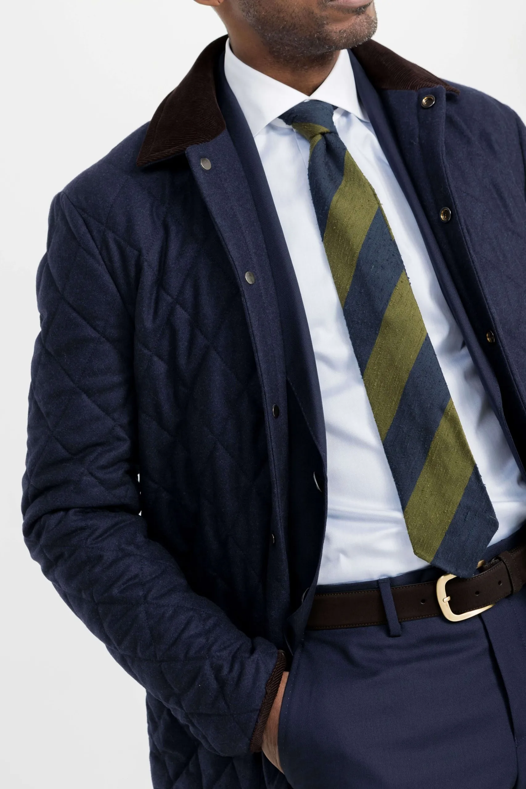 Confectionnée dans une flanelle de laine déperlante signée Vitale Barberis Canonico, cette veste protège des petites pluies tout en laissant la peau respirer. Sa coupe droite lui confère une silhouette structurée, et son matelassage discret permet de l’enfiler dès la fin de l’été sans risquer d’avoir trop chaud. Les finitions en velours côtelé brun apportent à la fois durabilité et caractère. Une pièce hybride et caméléon, à superposer sans effort sur toutes vos tenues.